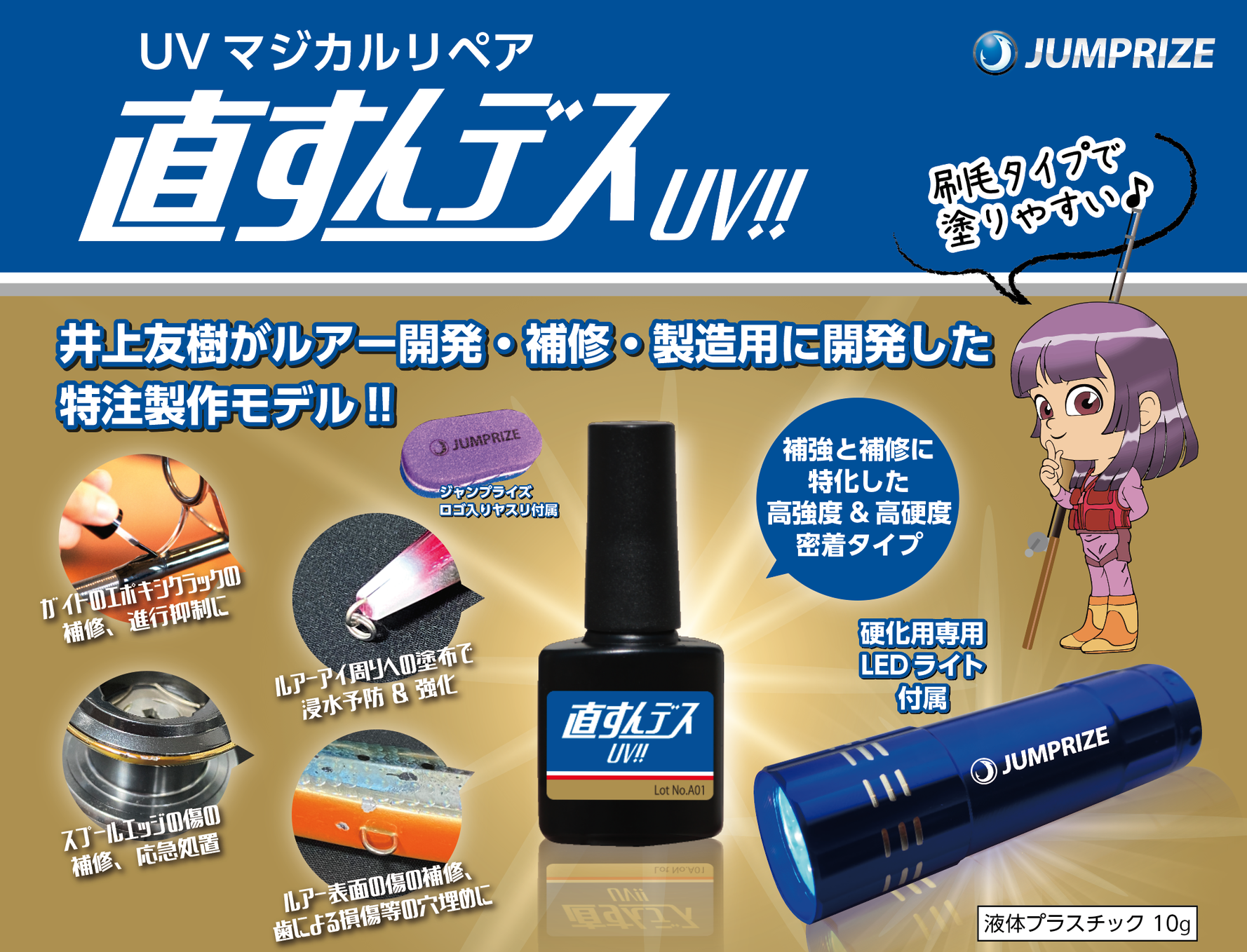 直したい部分に塗り、付属の専用UV LEDライトを4秒当てれば瞬時に硬化する魔法の液体プラスチック、