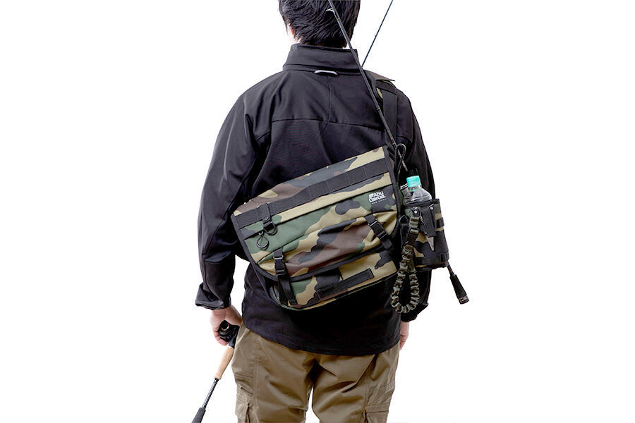 フラップ部に立体パターンを採用したファスナーポケットを備えており、細かなものや薄手のウエアも収納可能です。ポケットの上端にはカラビナやクリップタイプのピンオンリールが取り付けやすいベルトループ付きで、プライヤー等の取り付けに便利なDリングキーホルダーも付属します。