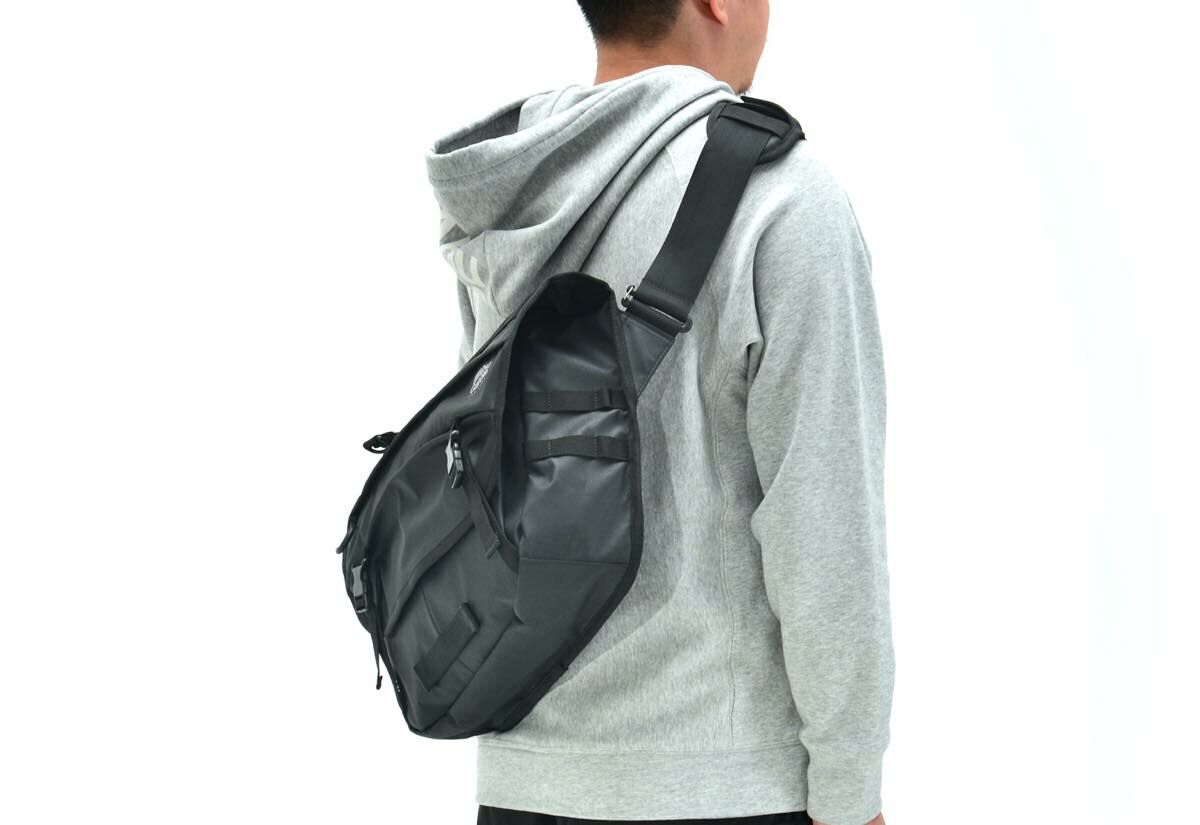 どちらの肩から掛けても正面に調節用のアジャスターが来るように、根元部分を取り外して入れ替え可能なデュアルストラップ形状