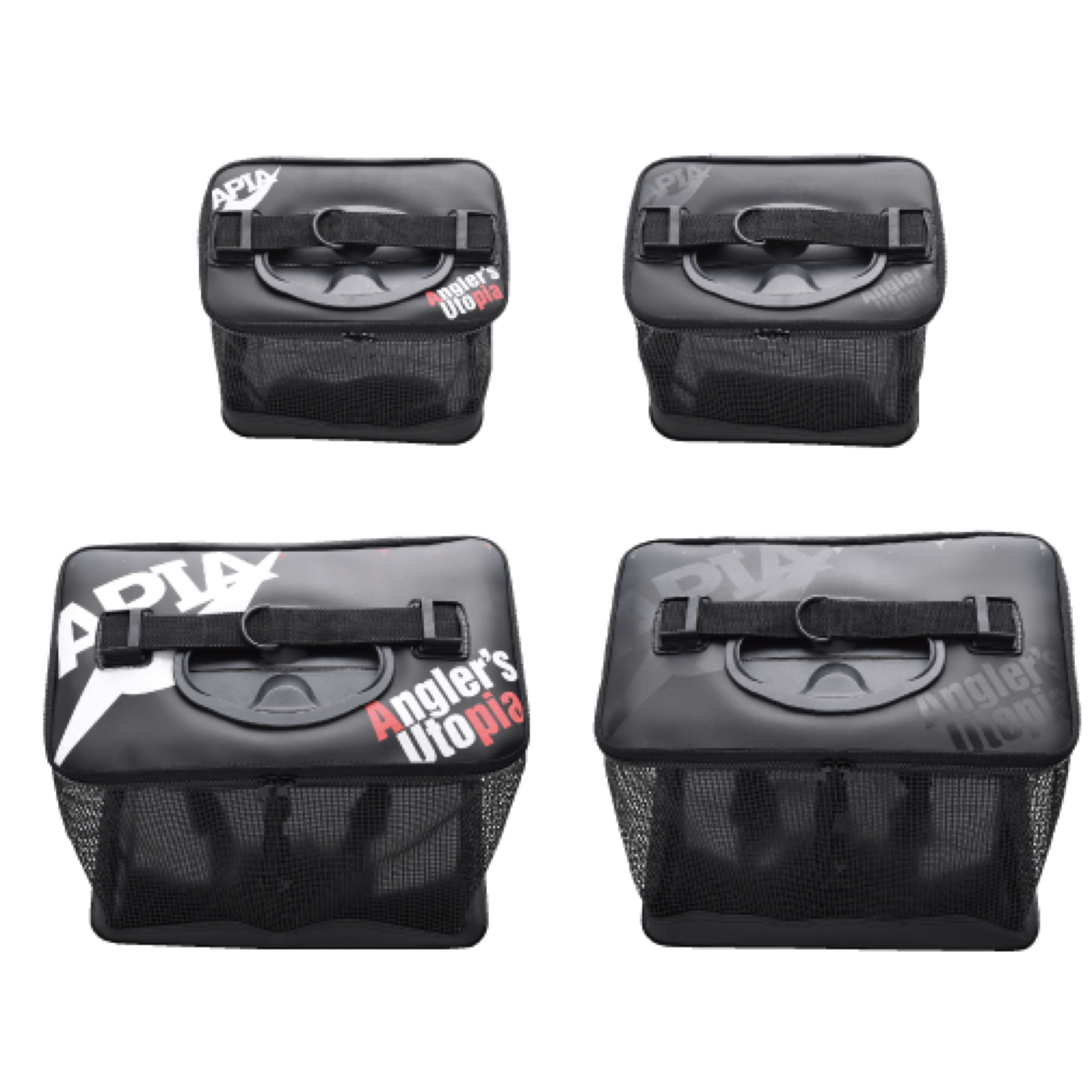 「こんなのあるといいな...」そんな半ばつぶやきから実際に製品となったのが、このフローティングスカリ。何が特徴か、一目瞭然。チャックを使わずとも上蓋にある窓がパカパカと開閉し、魚を出し入れ。勿論、外から入れることは可能だが、中からは開かない仕組み。いかにもAPIAらしいギミックで、ソルト用には無かったスカリが完成した。ネットインした魚をフィッシュグリップでホールドし、そのまま窓からスルリと中へ。チャックを開けて...入れて...閉めて...という煩わしさが無く、素手で触れることもないため魚への負担も最小限。加えて先に入れている魚を誤ってリリースしてしまうというリスク回避にも。底に設けたマチにより、少し水を溜めたままの移動も可。