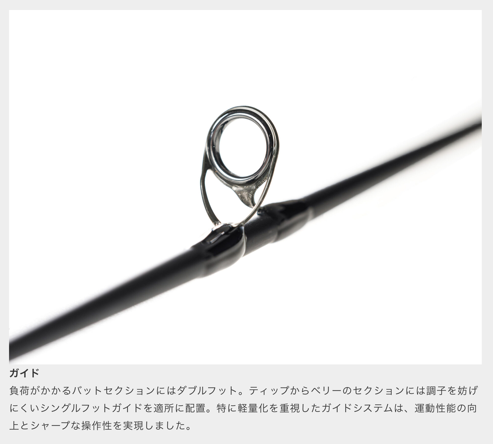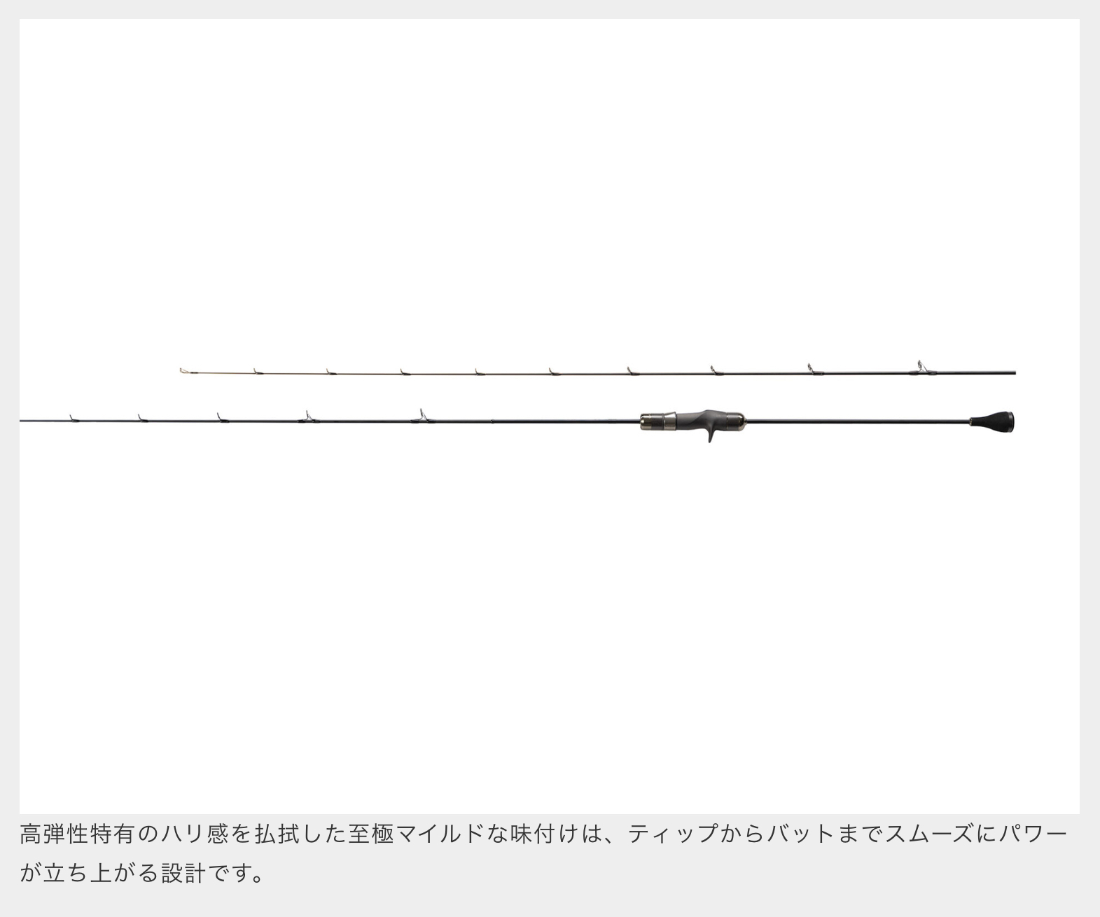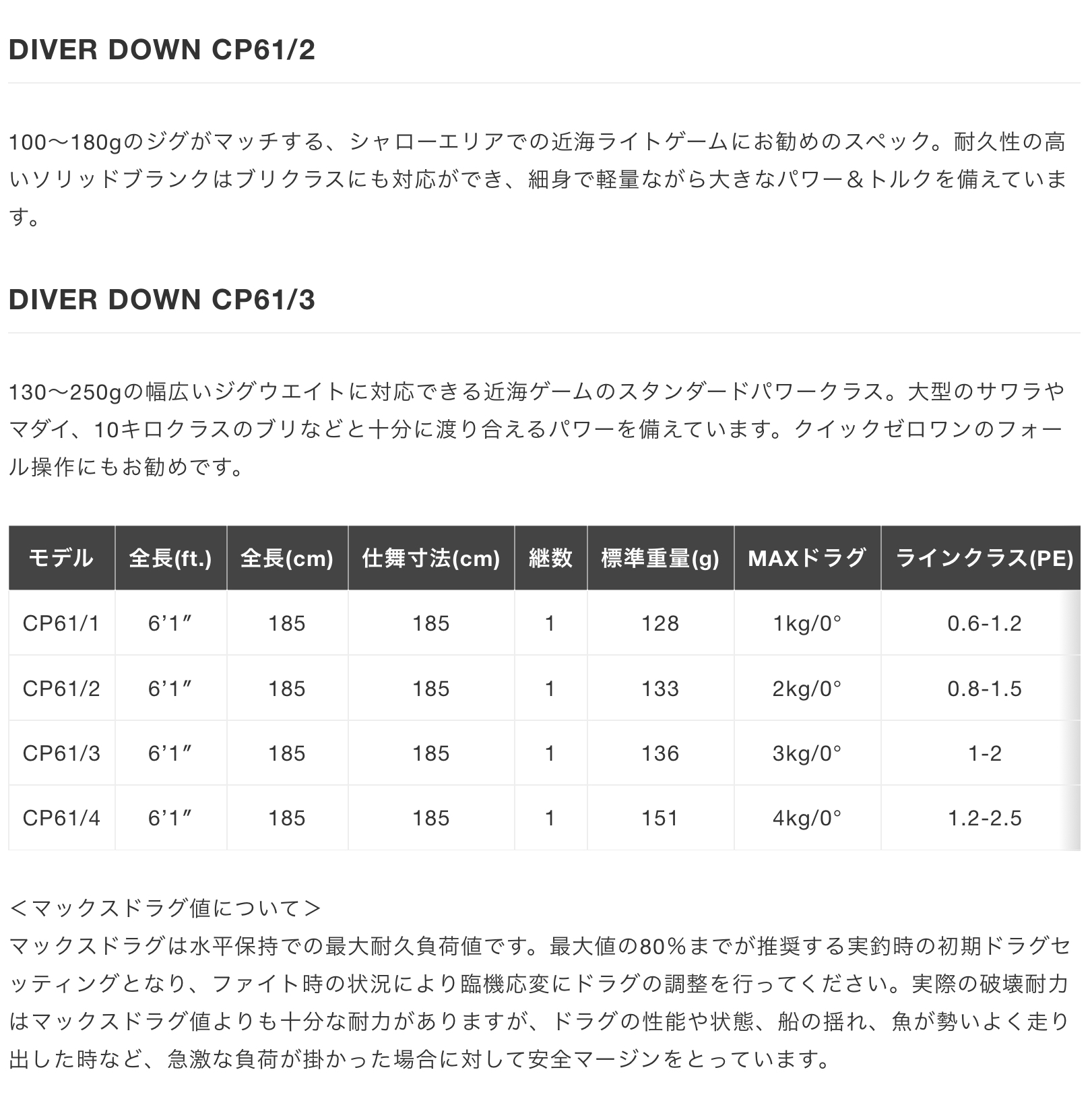 ソリッドブランクのダイバーダウンはチューブラーSSRシリーズと同様のシャープな反発力を持たせた軽快なアクションで、さらに軽く、細くを追求し、そしてソリッドブランクならではの高い耐久性を兼ね備えています。超細身なその見た目からは想像し難いほどのトルクフルなパワーを発生させ、わずかな入力でもジグがグッと引き上がるリフト力をリアルに体感ができ、竿のパワーを併用した効率的なロッドワークでは長時間の操作でも疲れにくく体力の負担を和らげます。「繊細かつパワーがある」、そのため適応するジグウエイト幅が広く1本のロッドで多くの条件に対応ができ、適応下限のジグウエイトであれば手首を返すほどの微入力でキレのあるジグアクションの操作が可能です。