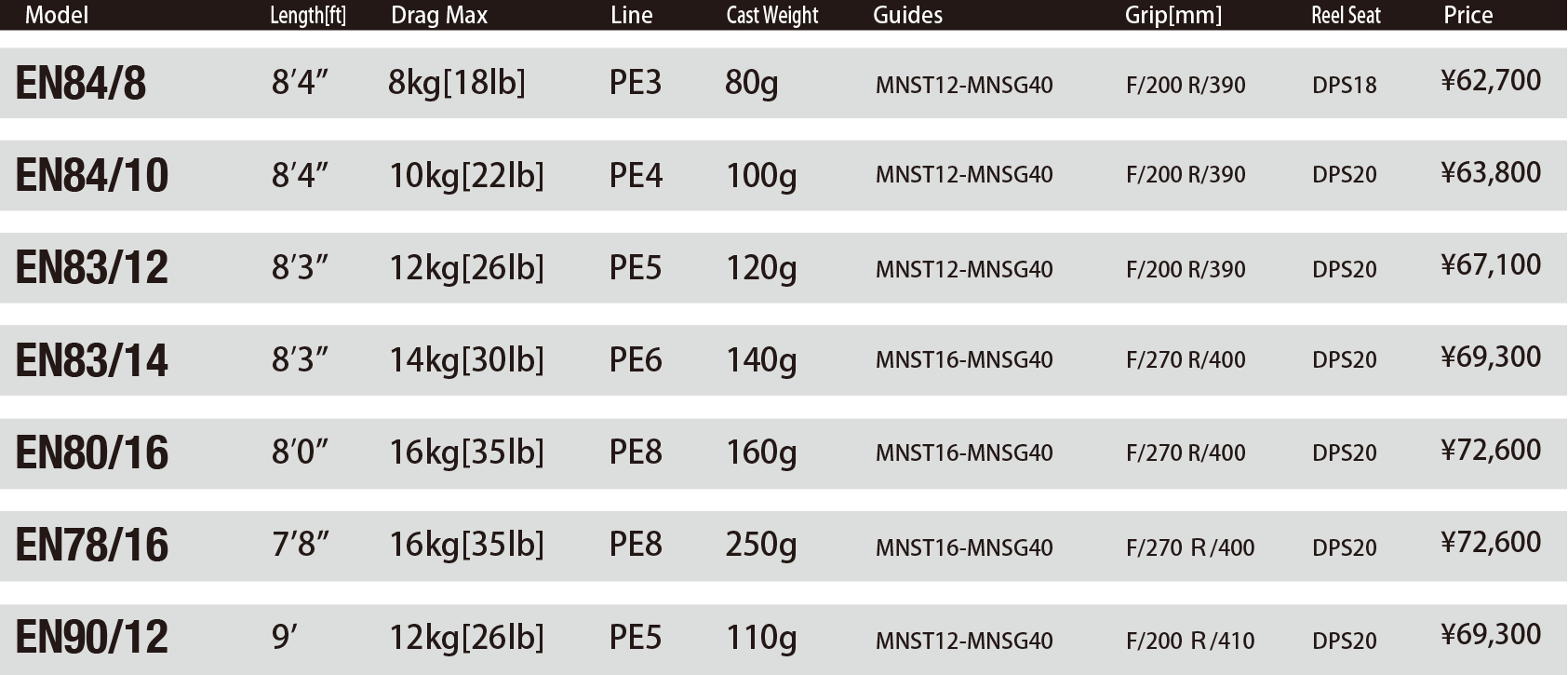 壱岐や五島、対馬の20キロを超えるヒラマサ、超難所のGTゲーム、茨城、三重沖のモンスターキハダなど、さまざまな超大型魚との真っ向勝負を可能にするEN80/16。ライアン230/250、ゾロ270など、100~140gのヘビープラグがベストマッチ。大型リールにPE8号、170ポンドリーダーでも1日中振り抜けられる体力負担の少ないアクション。ファイト時の超高負荷にも伸されにくい支点位置とスムーズな支点移動。