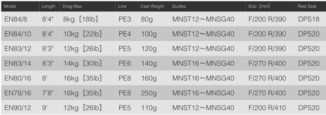 パワークラスにより抜けと操作性のバランスがとれた耐久性重視のガイドシステム。PE6号以上のヘビークラスにはロッドを立てファイトが行いやすいようロングフォアグリップを採用。リールシート及びグリップEVAは力を込め握りやすいよう極力細く、EVAには適切なテーパーをかけ機能美を追求。長時間のファイトにもリールのガタつきを最小限に抑える、バックストップダブルナットを全機種に採用した。
