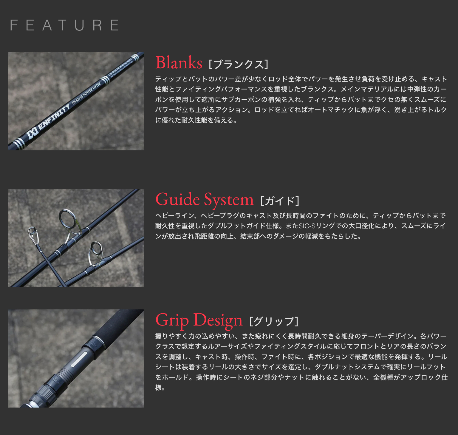 アンフィニティは国内、海外のヒラマサやブリなどの青物、GT、マグロ類を対象にさまざまな条件下で徹底的に叩き上げ、ずば抜けたリフティングパワーと耐久力、高負荷時にロッドを立てアングラーが耐えやすい理想のアクションを手に入れた。アンフィニティはちょうどGT用ロッドとヒラマサ用ロッドの中間的な性質を持ち、マグロゲームにも十分に対応するヴァーサタイルパワーロッドである。