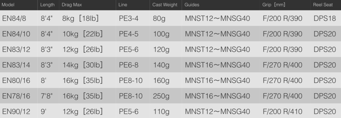 30キロを超えるマグロ、15キロクラスのヒラマサと十分に対峙でき、また女性や体格の小さなアングラーのライトGTロッドとしてもお勧めするEN83/12。ライアン200やゾロ220/240、ロデオ195/215など、多くのアングラーが最も振り抜きやすい70~110gのミディアムプラグに圧倒的な飛距離を与えられるキャスタビリティ。中型リールにPE4~6号、130ポンドリーダーまでがスムーズに抜けるガイドシステム。