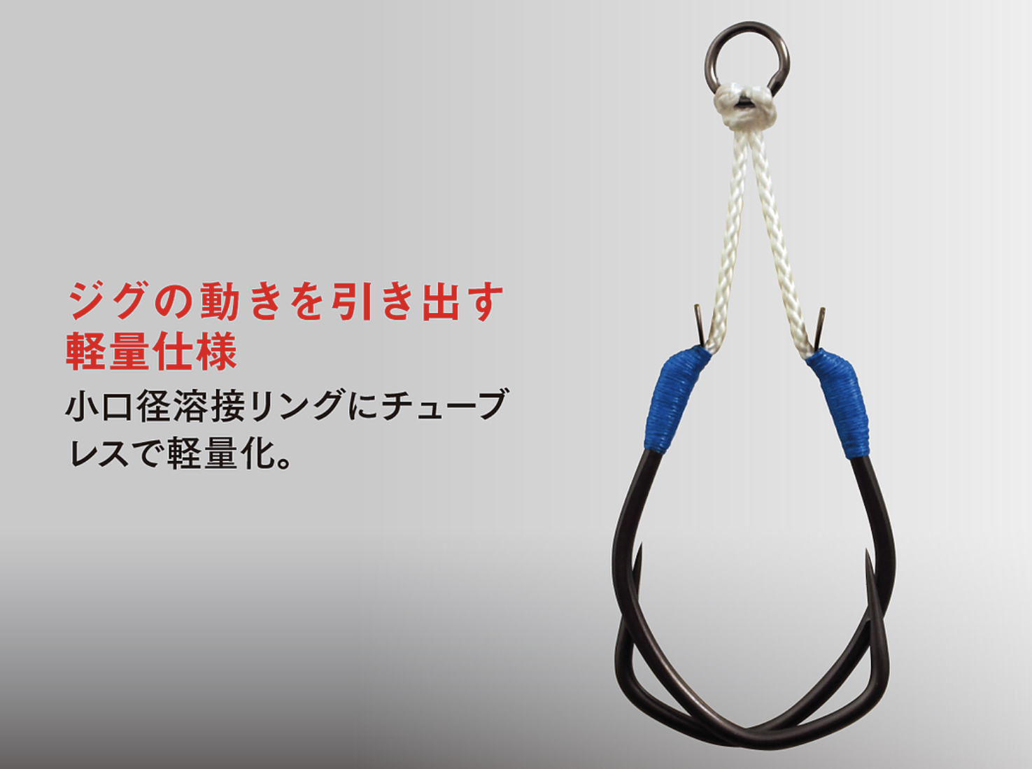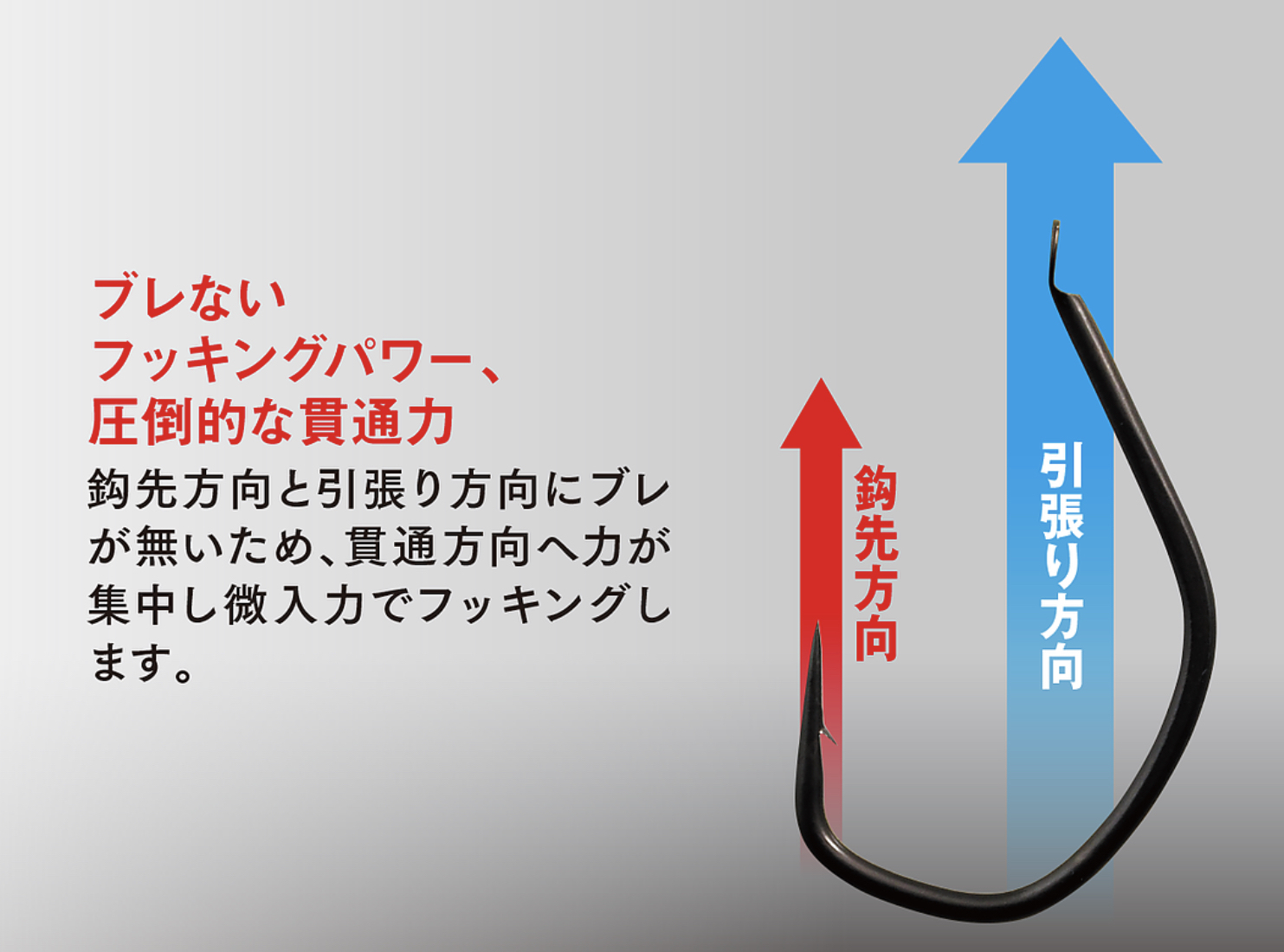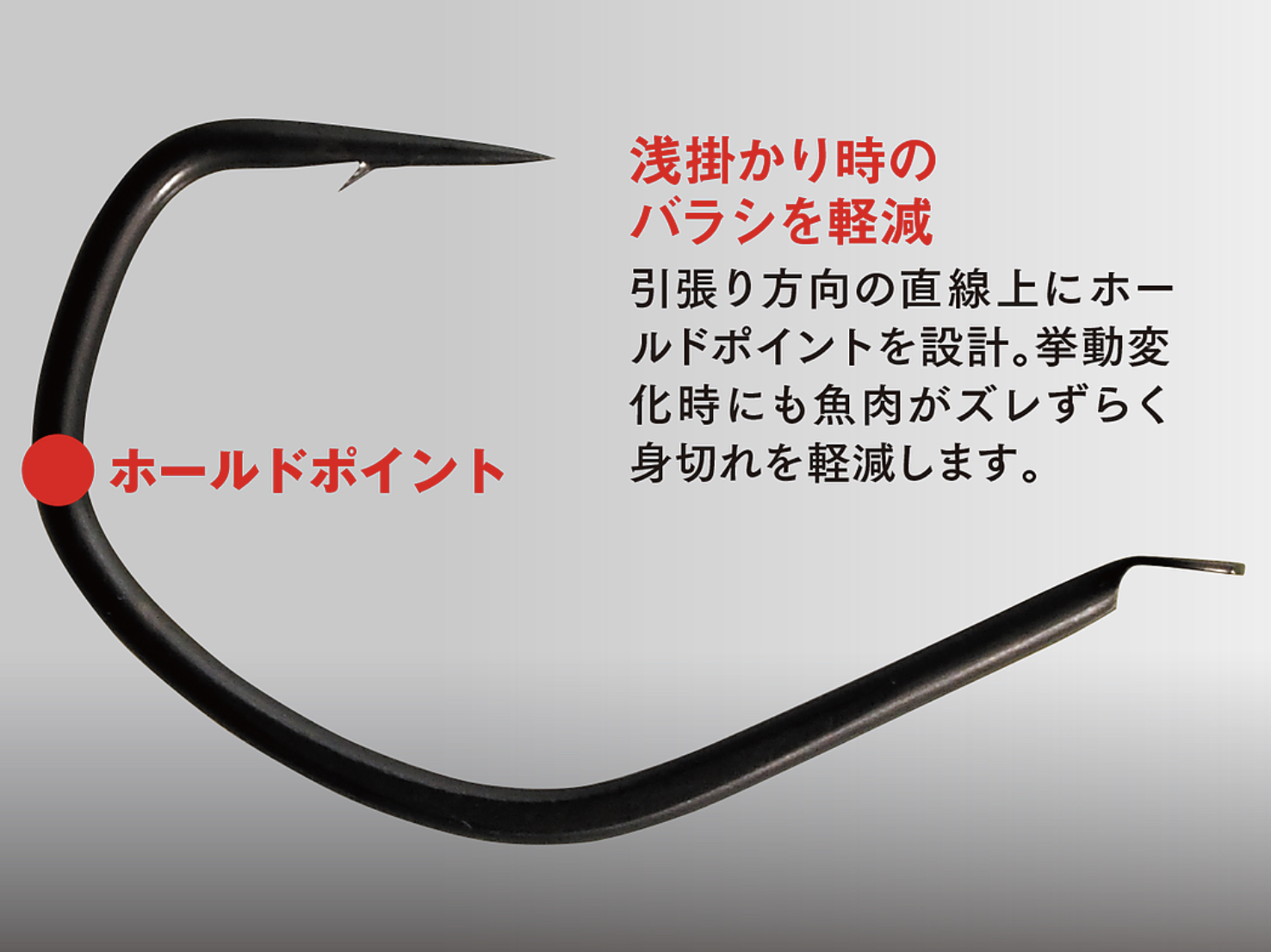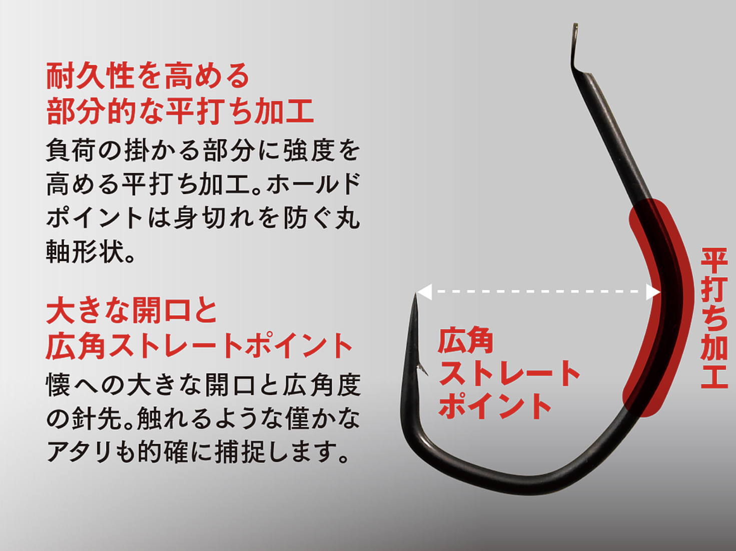 広角ストレートの鈎先が瞬時に獲物を捕らえるハンティングフック。魚が触れた瞬間に刺さる、ライトジギングゲームに最適な形状。