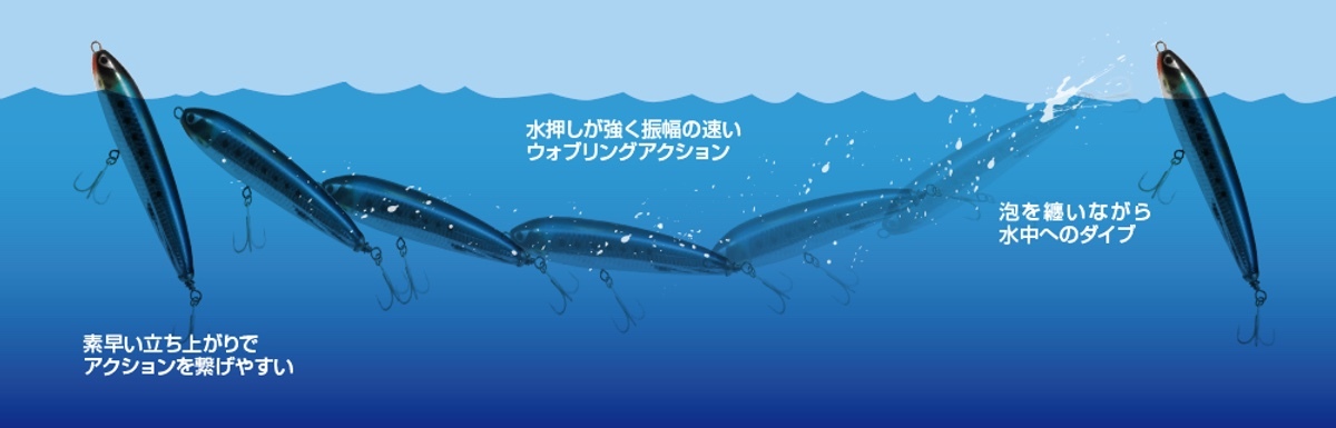 着水後は潜行させて水面直下でアクションを行う。暴れすぎない適度な入力で、ダイブからの水中ウォブリング→浮上の繰り返しが基本の操作。ラインスラッグを与えると左右へのスライドアクション、またタダ巻きでも泳ぐためリーリングジャークも得意とする。