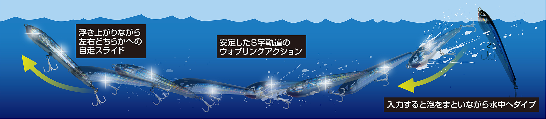 着水後は水面を飛び出さない加減で、中低速のミディアム~ロングピッチのジャーキング、リーリングで操作を行う。水面直下でのウォブリングアクションは入力するだけでオートマチックに、容易な操作で演出ができる。テンションが抜けてラインスラッグが生まれると左右いずれかへの自走スライドを起こし、ウォブリングアクションとの合間でリアクションバイトを誘発する。