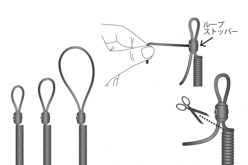 両側のループトッパー穴に付属の六角レンチを差し込み緩め、ロープを好みにセッティングし、六角レンチで締め付けて下さい。
