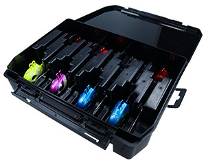 船で使用するタチウオテンヤ専用収納ケース。ケース内で転がったり傷ついたりして収納に困りがちなテンヤをスマートに収納。仕切り付き専用トレイにより30号~50号のテンヤを交互に並べて8本収納可能。平行に並ぶことでカラーやサイズが一目で分かり、取り出しやすい構造。一体式バックル採用により開閉がスムーズに行なえ、本体側面のバランススタンドにより縦置きで自立可能。TBタックルボックスにジャストサイズで収納可能。