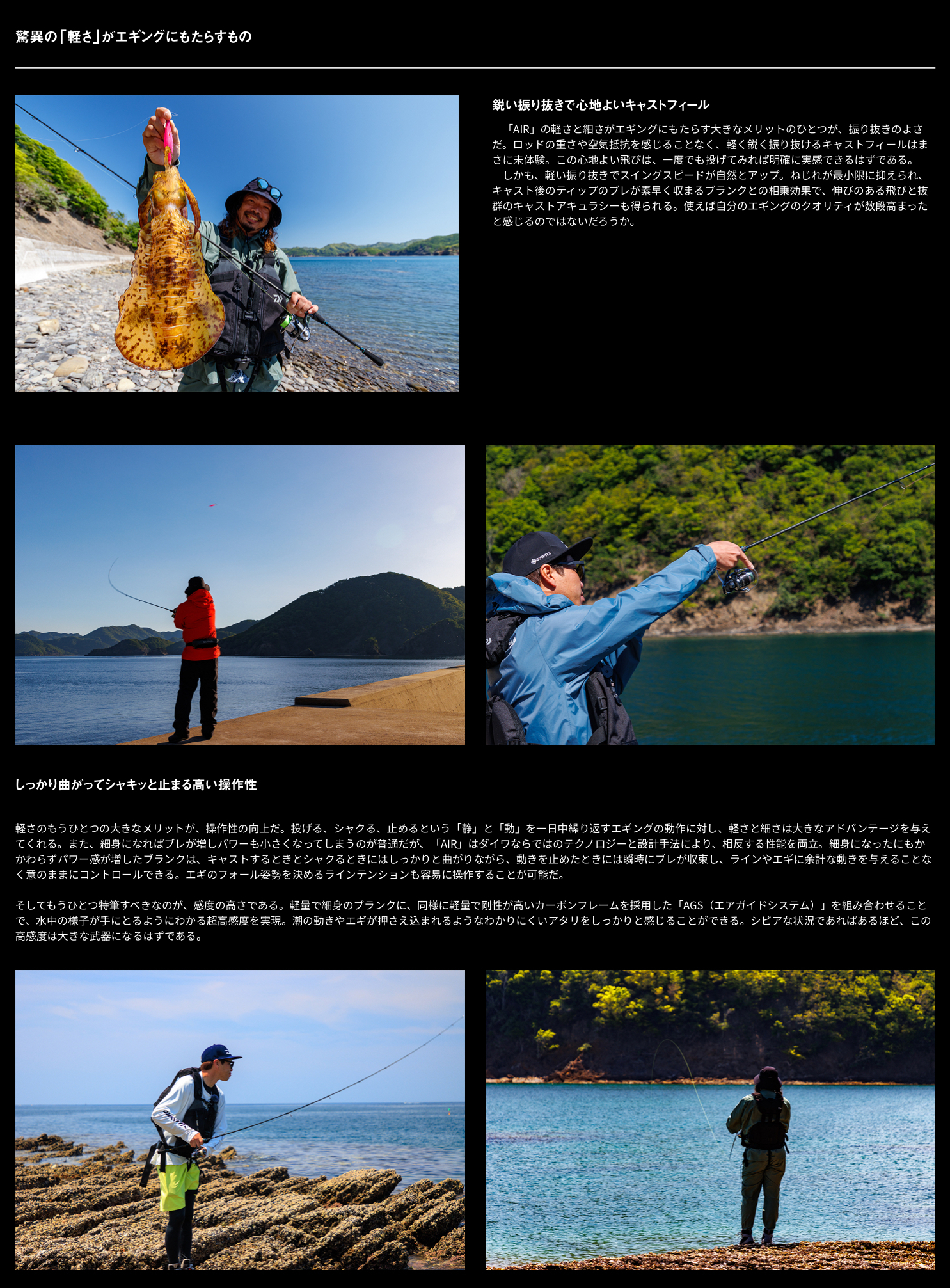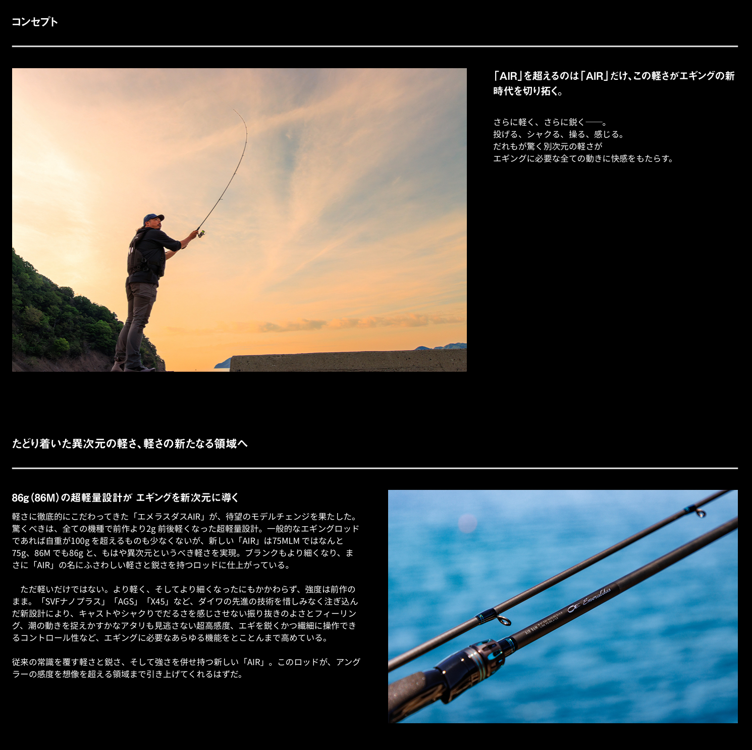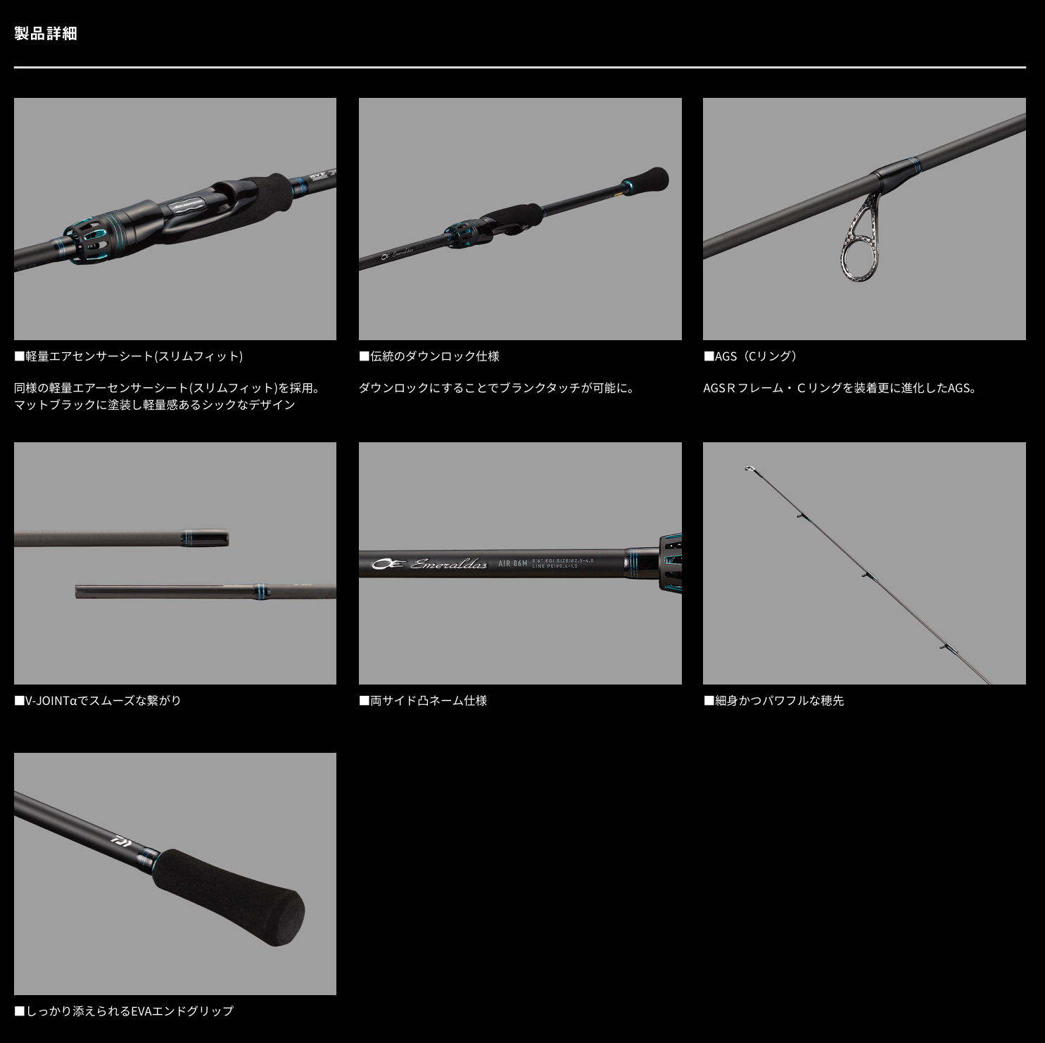 軽さにとことんこだわりぬいた「EMERALDAS AIR 」。その軽量性は大幅な感度の向上と疲れ知らずの操作性をもたらし、投げる・シャクるといった動き一つ一つに快感をもたらす。さらにその軽さは、アングラーの動作をあらゆる角度からサポートし、今までの軽さの常識を塗り替えながらその先をいく、まさに「AIR」を感じるロッドが完成。
