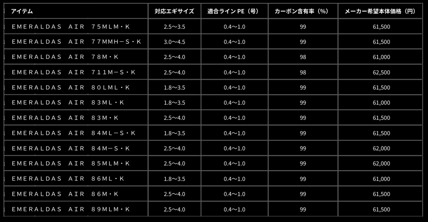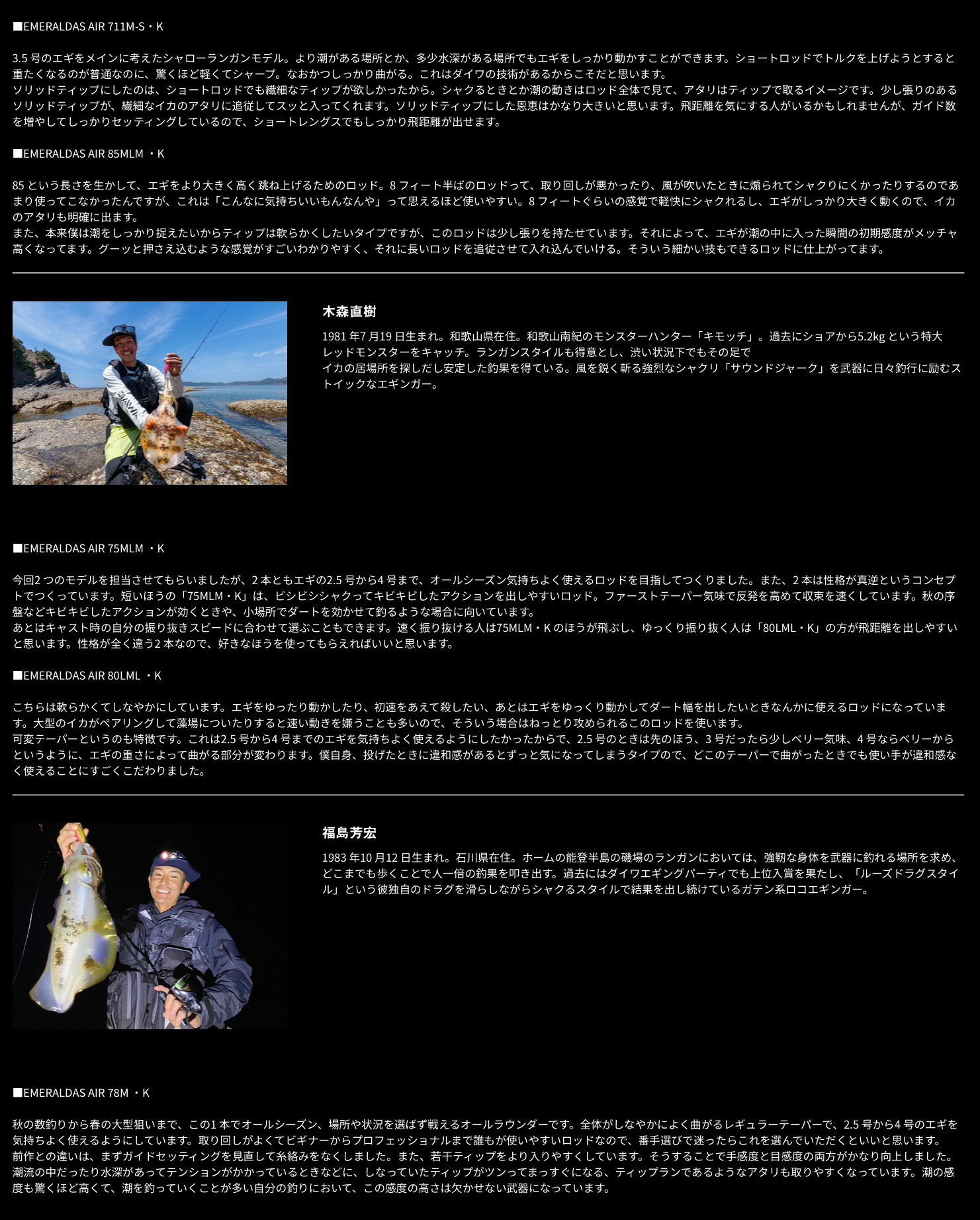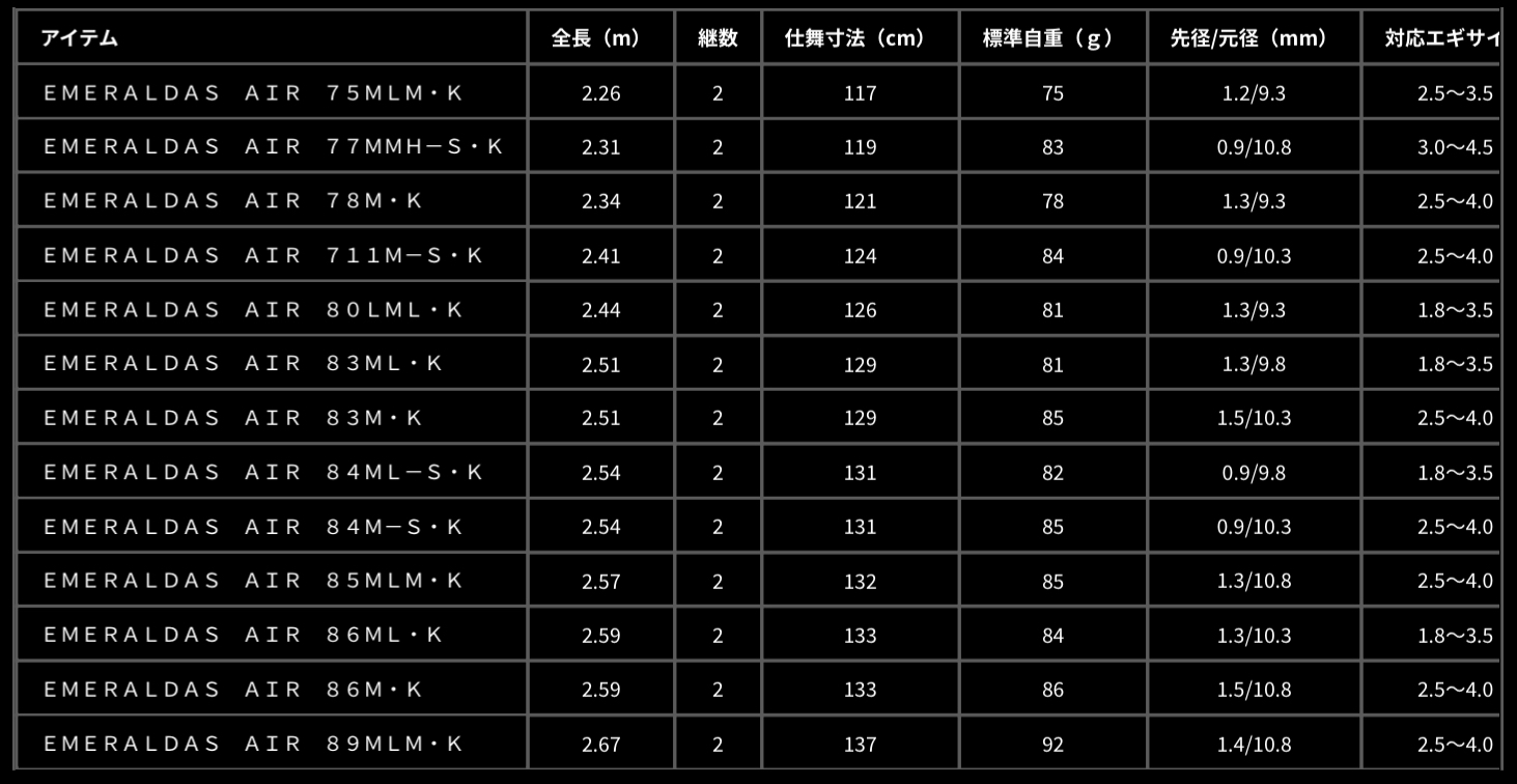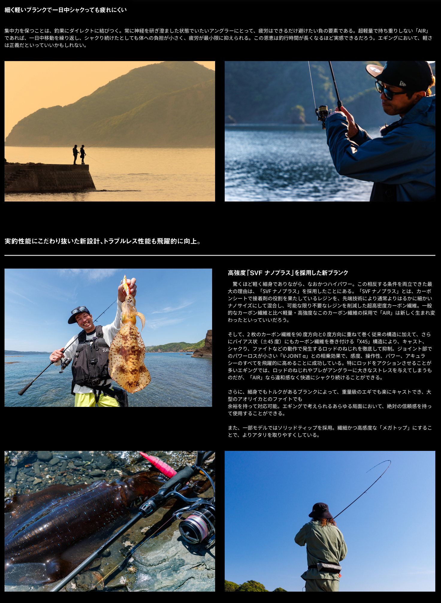 軽さにとことんこだわりぬいた「EMERALDAS AIR 」。その軽量性は大幅な感度の向上と疲れ知らずの操作性をもたらし、投げる・シャクるといった動き一つ一つに快感をもたらす。さらにその軽さは、アングラーの動作をあらゆる角度からサポートし、今までの軽さの常識を塗り替えながらその先をいく、まさに「AIR」を感じるロッドが完成。