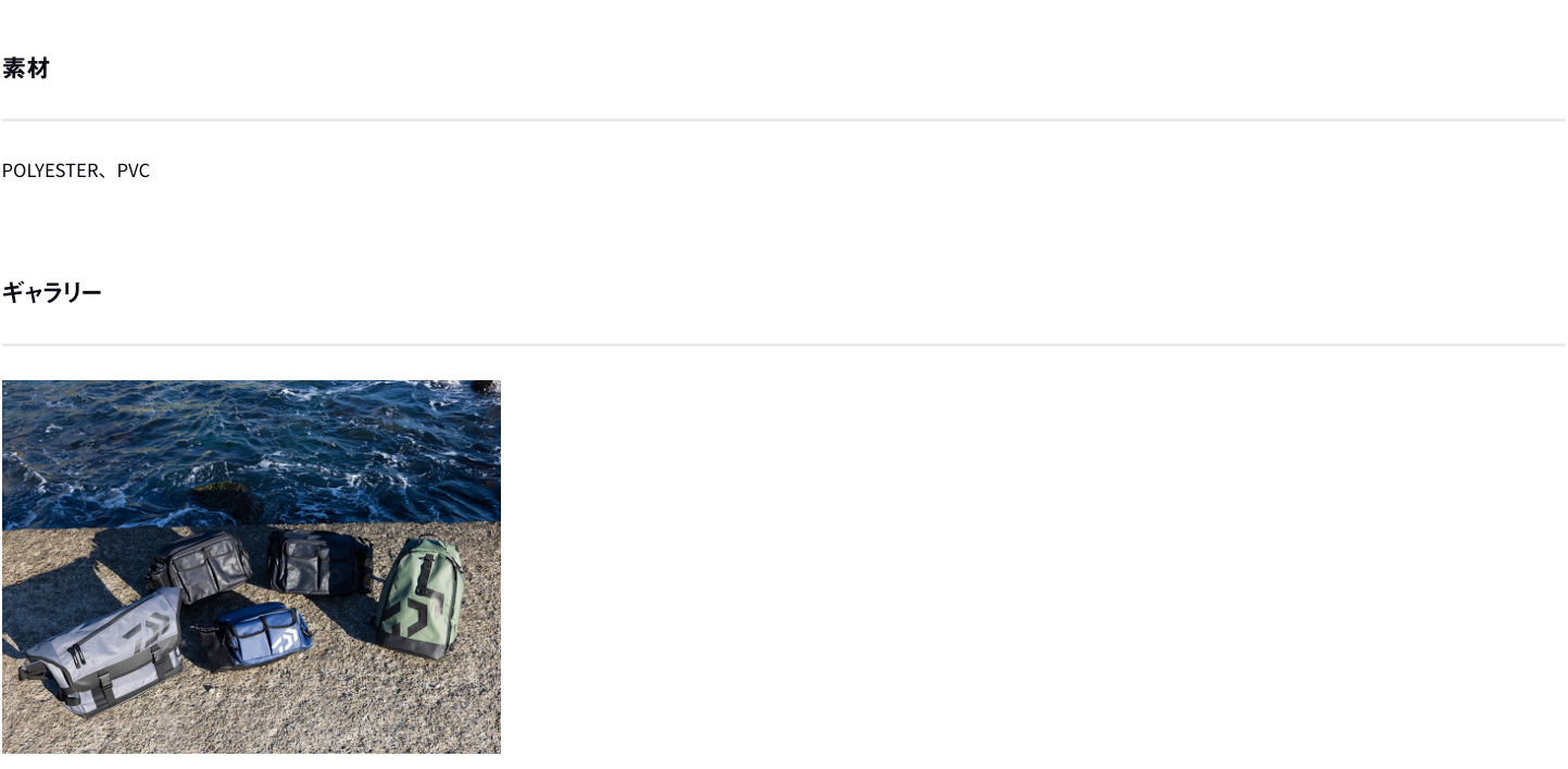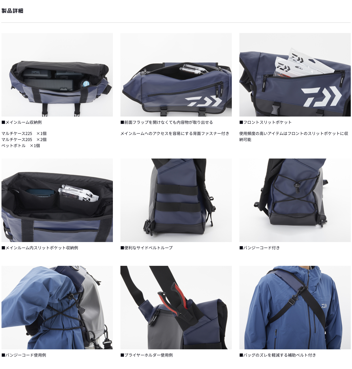 前面フラップを開けなくても内容が取り出しやすい背面ファスナーを備えたバッグ。メインルームには中型ボックス(26×19cm程度)を4個収納可能で、小物類の収納に便利なスリットポケットを4か所に配置。ポーチや小物類が取り付け可能なサイドベルトループ、プライヤーホルダー、ペットボトルホルダー(内側)、Dリング付き。バッグ全体には水に強いPVC表面生地(フレンチネイビーP、ブラックPのみ)を使用し、肩への負担を軽減するパッド付き肩ベルトと、バッグのズレを軽減する補助ベルト付き。また、ウエア等を仮収納できるバンジーコードも装備。