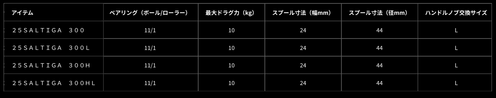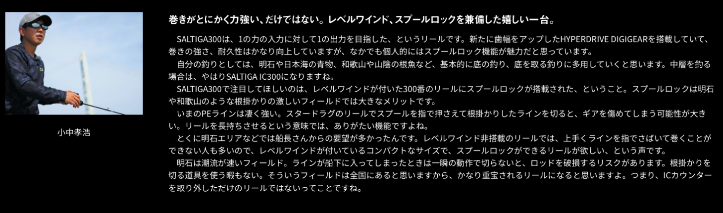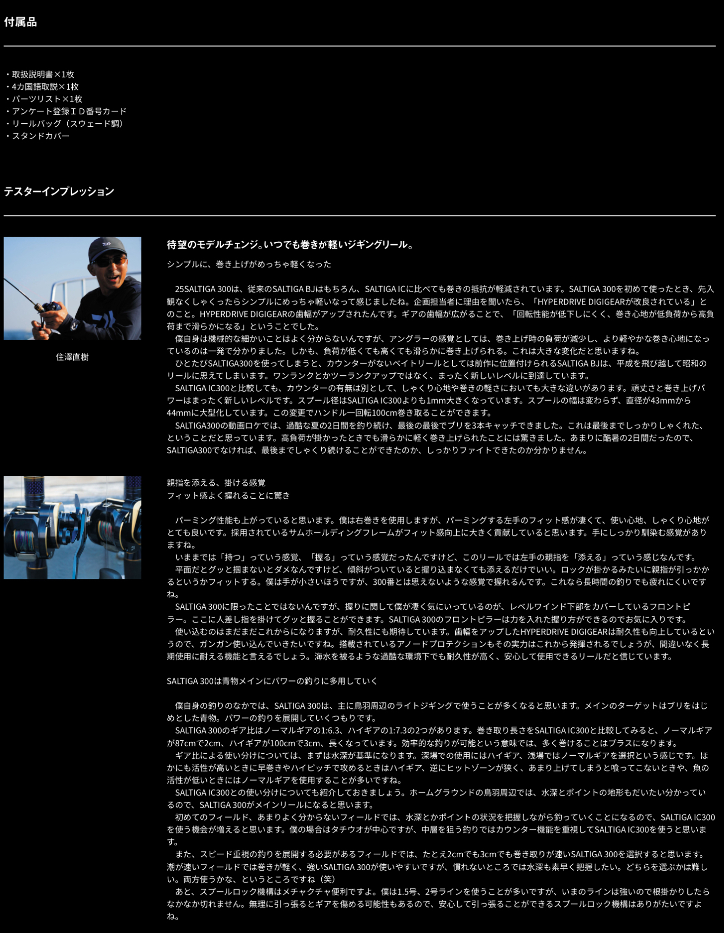 SALTIGA 300のHYPERDRIVE DIGIGEARは歯幅UP仕様。低負荷から高負荷まで滑らかで、力強い回転性能を発揮する。また、HYPER DOUBLE SUPPORT、HYPER TOUGH CLUTCH、HYPER ARMED HOUSINGを搭載し万全の仕様を目指した。フレームにはサムホールディングフレームを採用し、コンパクト化のメリットを覆す優れたパーミング性能を発揮する。さらにハンドル側サイドプレートにはアノードプロテクションを搭載した。過酷な環境下を想定して作り込んだSALTIGA 300は、近海ジギングを攻略し尽くす新たな武器となるだろう。