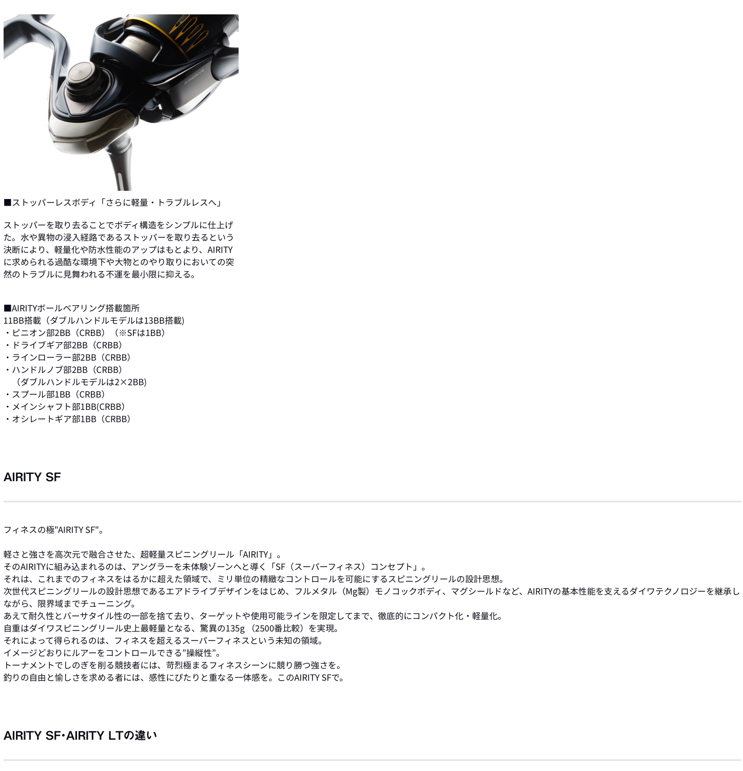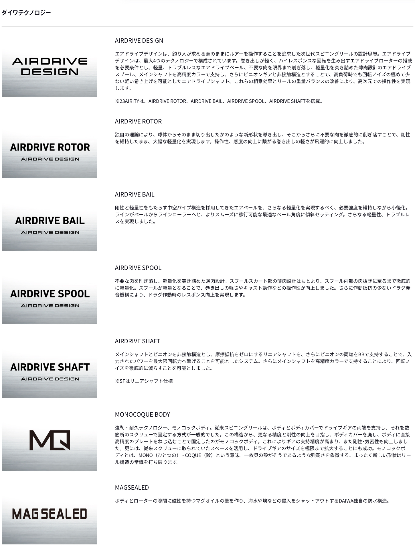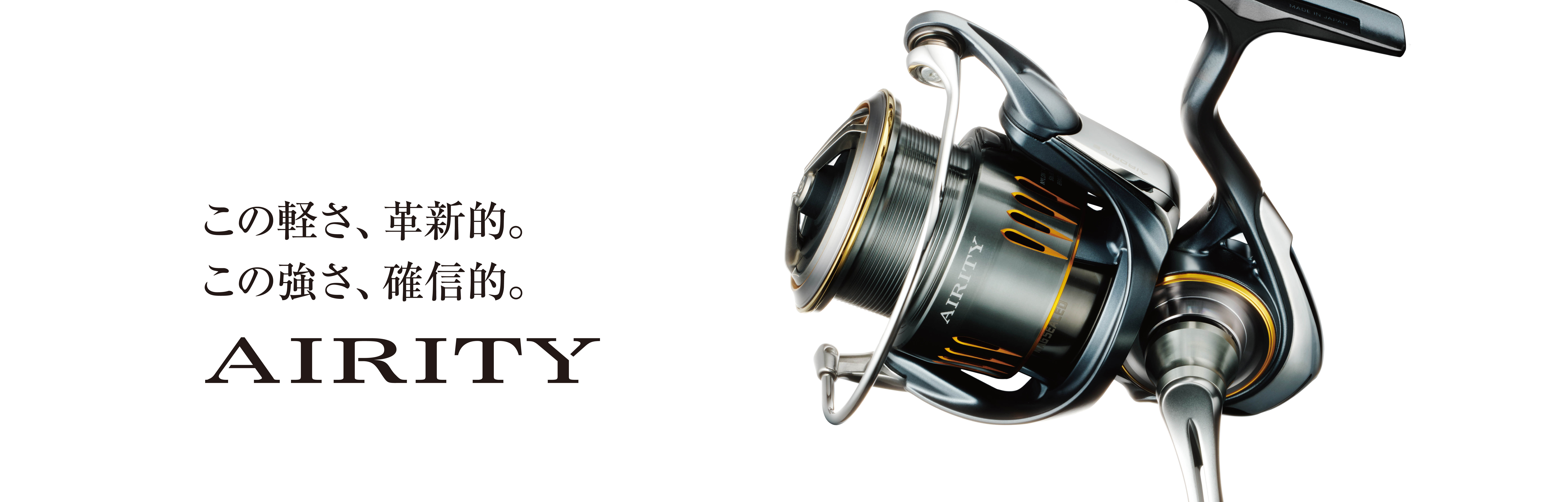 「AIR=軽さ」と「REALITY=真実・実用性」の高次元での融合。高度な実釣性能を備えた超軽量スピニングリール。ライトゲームからライトショアジギングまで、タックルとひとつになれる自由と愉しさを、AIRITYで――。