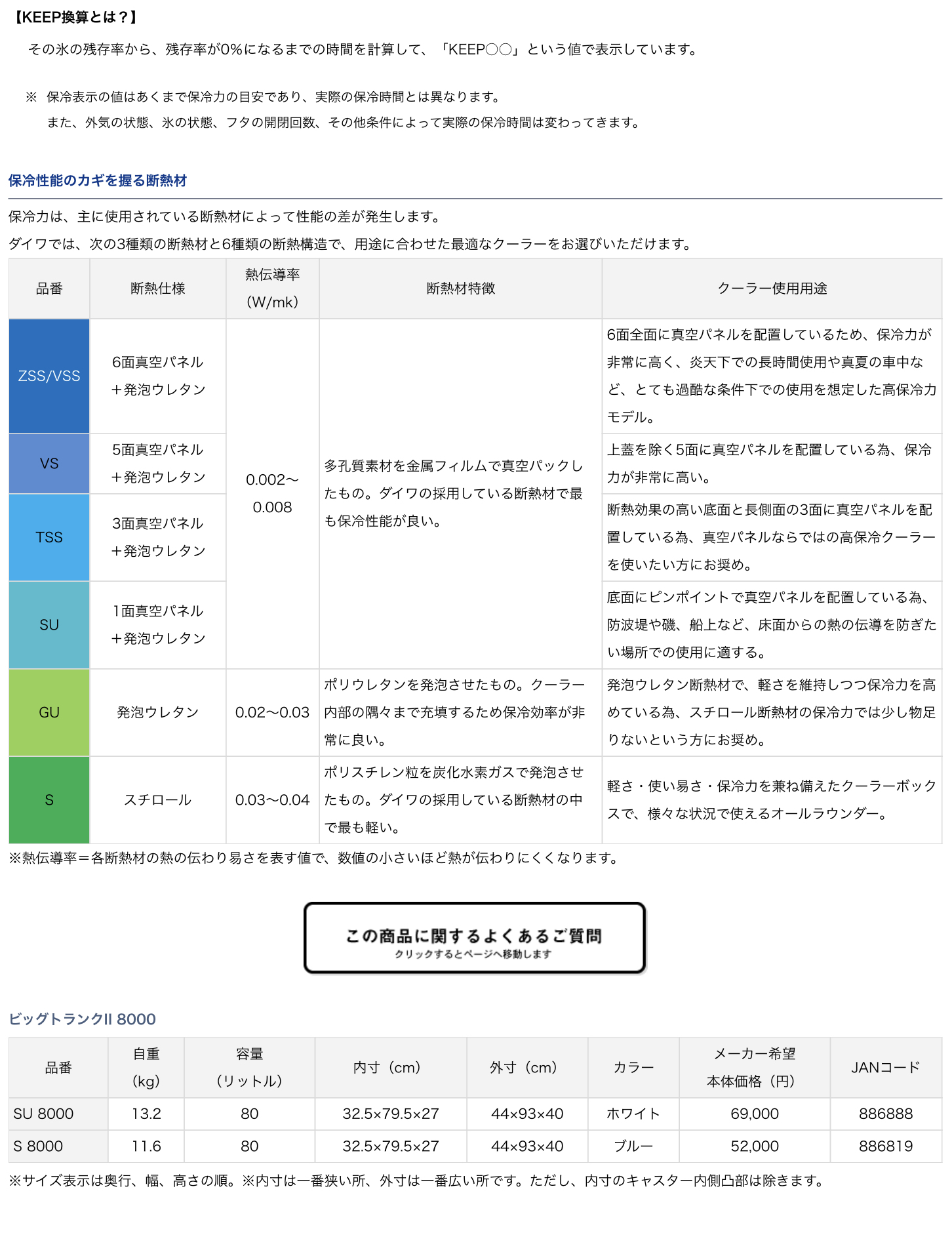 | ブリやヒラマサなどの大型青物が数多く釣れる釣りや深海のキンメ釣りなど、相当な収納力が求められる釣りで活躍する大型クーラーボックス。釣りはもちろんキャンプなどのアウトドアシーンでたくさんの飲食物をしっかり冷やして持ち運びしたいシチュエーションにも最適。 |
