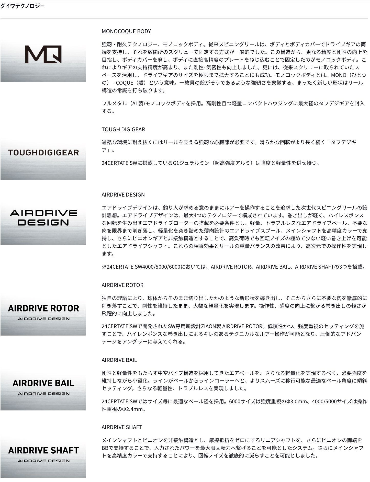 次世代スピニングリールの設計思想であるエアドライブデザインをはじめ、アルミ製フルメタルモノコックボディ、マグシールドなど、CERTATEの基本性能を支えるDAIWA独自の最先端テクノロジーを踏襲。その血脈を受け継ぎ、ソルトウォーター専用モデルとして必要不可欠な性能を突き詰めている。