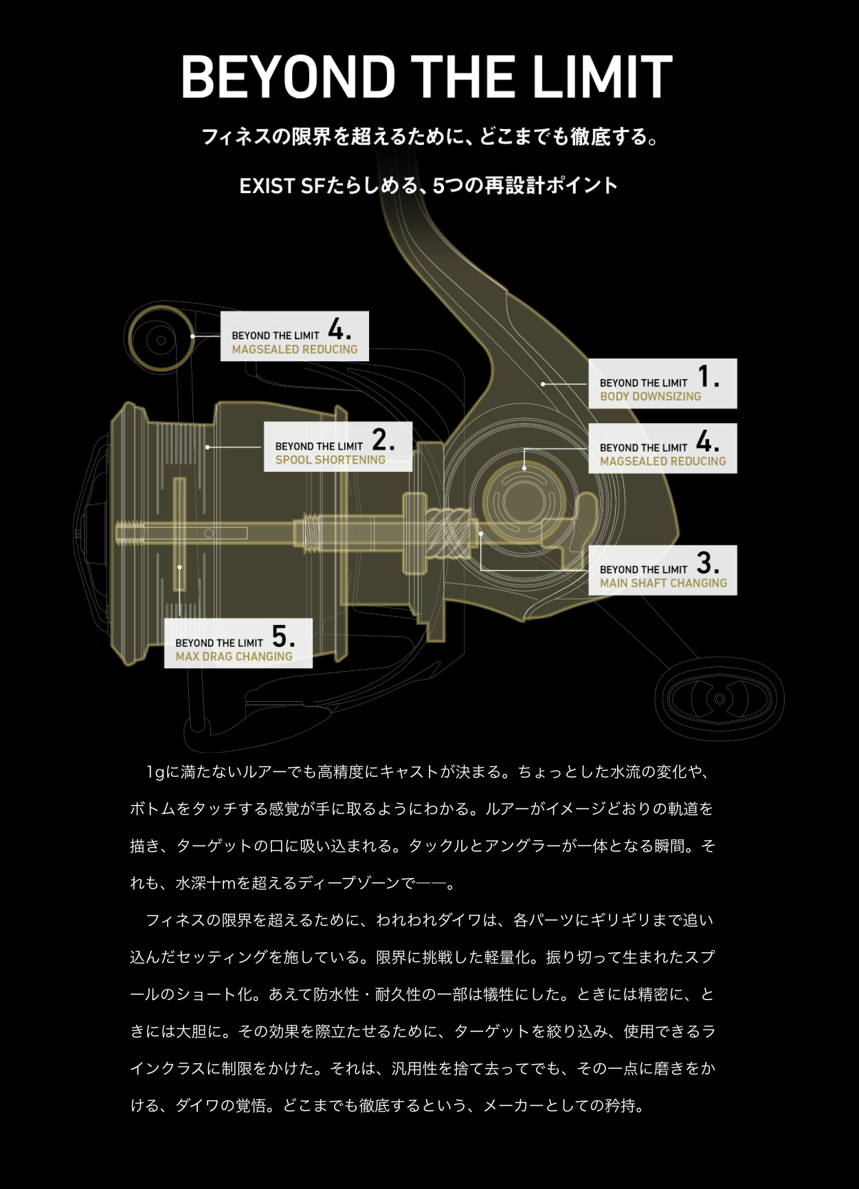 SF(スーパーフィネス)コンセプト――これまでのフィネスを、はるかに超えた領域で、ミリ単位の精緻なコントロールを可能にするスピニングリールの設計思想。この新たなチャレンジに、われわれダイワは、小型スピニングリールのフラッグシップ「EXIST」を選んだ。それは、なぜか。