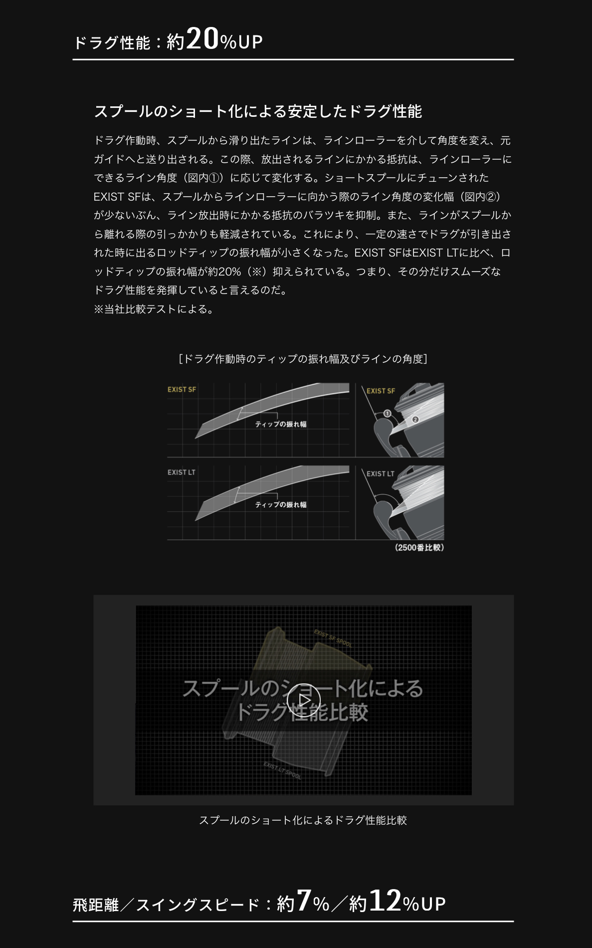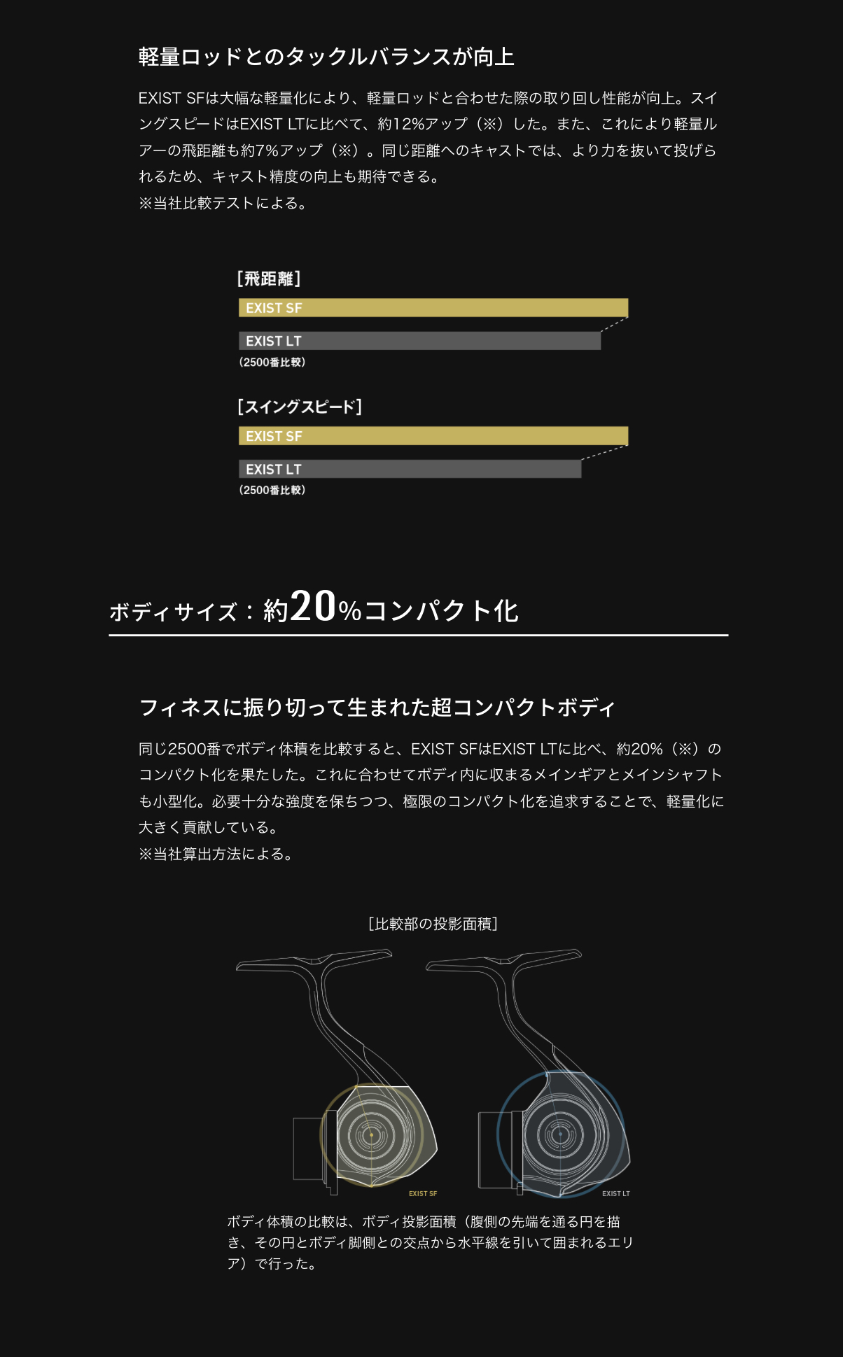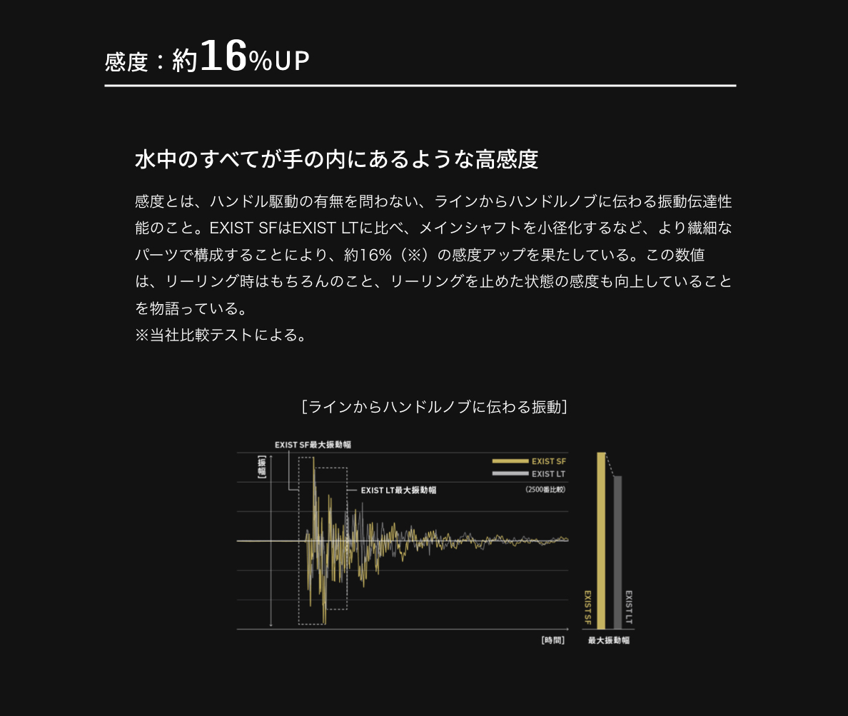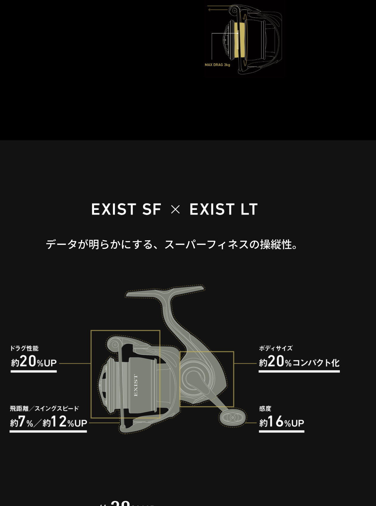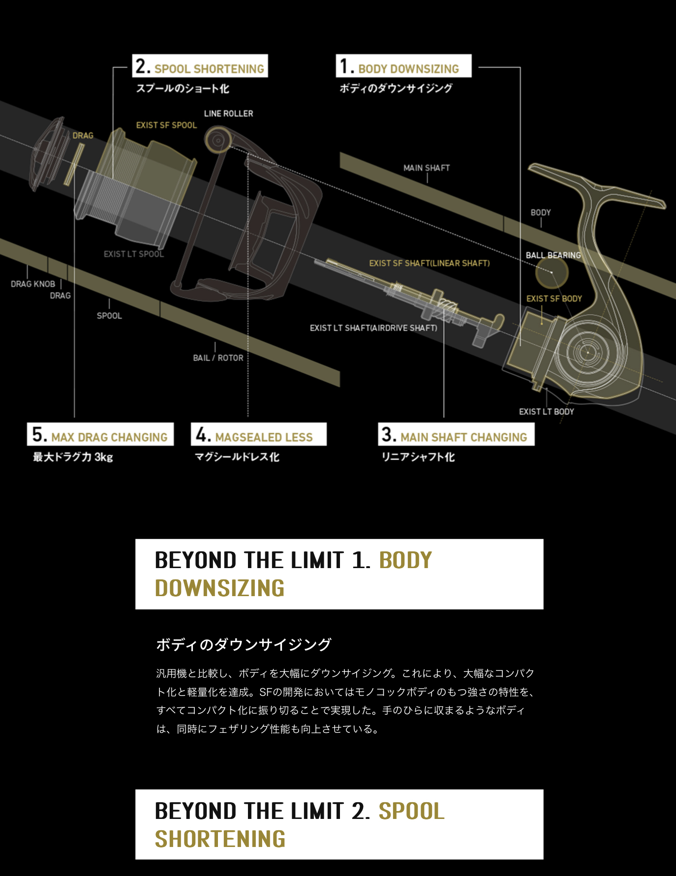 エアドライブデザイン、フルメタル(Mg製)モノコックボディ、マグシールドといったEXISTの基本性能は維持したまま、ギリギリまで追い込んでチューニングしている。ターゲットを、4lb(フロロ・ナイロン)もしくは0.6号(PE)以下のラインを用いたバス、トラウト、ライトソルトに絞り込み、徹底的にコンパクト化・軽量化。そのために一定レベルの耐久性・防水性は削ぎ落としたが、それらによって得られる対価は、いまだだれも踏み入れたことのない領域。