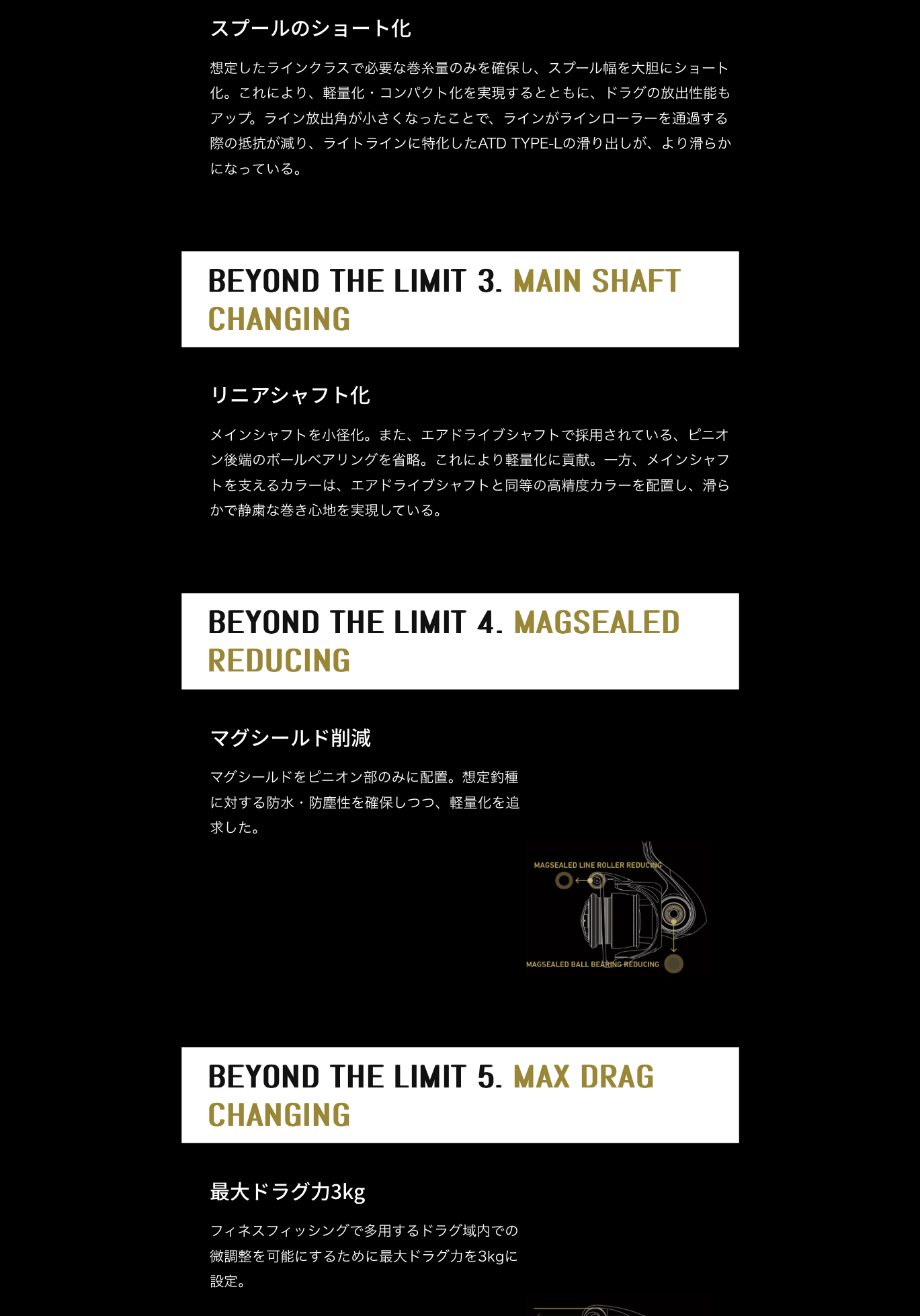 これまでのフィネスの限界域をはるかに超えたその先で、心に描いたイメージどおりにルアーが軌道を描く“操縦性”は、魚との一対一の濃密な時間をもたらせてくれるだろう。ギリギリまで絞り込んだ自重は、過剰な力を加えなくても振り抜けるキャスティング性能となって、飛距離と精度に貢献する。手のひらに包み込めるようなコンパクトなボディは、繊細なタッチでのフェザリングを可能にし、狙い通りのアプローチを約束してくれるだろう。ショートスプールはATD TYPE-Lによるラインのスムーズな滑り出しを、より高度な次元まで昇華させた。