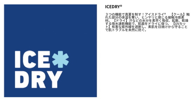 接触冷感性、遮熱性、吸水速乾機能があり、着るだけで快適で涼しいアイスドライ®素材を採用。