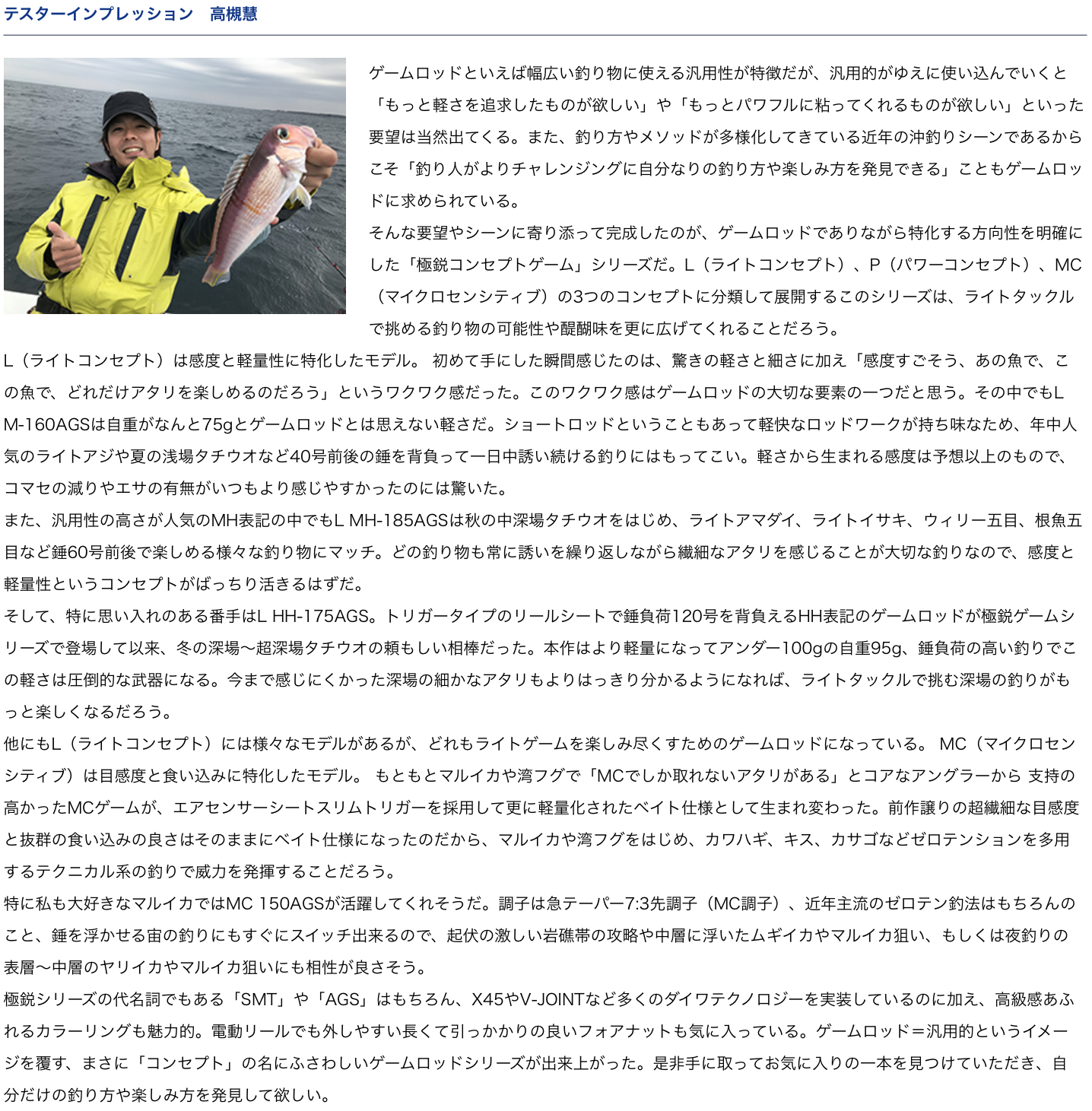 釣法の変化やタックルの進化により、ゲームロッドに求められる性能は多様化している。同じ対象魚を狙う中でも「もっとライトに」「ゲームロッドで大物を」「自分だけのアタリを」など、釣り人の想いは留まることを知らない。極鋭コンセプトゲームはL(ライト)、P(パワー)、MC(マイクロセンシティブ)とアイテムごとの方向性を明確化。ゲームロッドはコンセプトに合わせて設計することで、さらなる進化を遂げた。 |