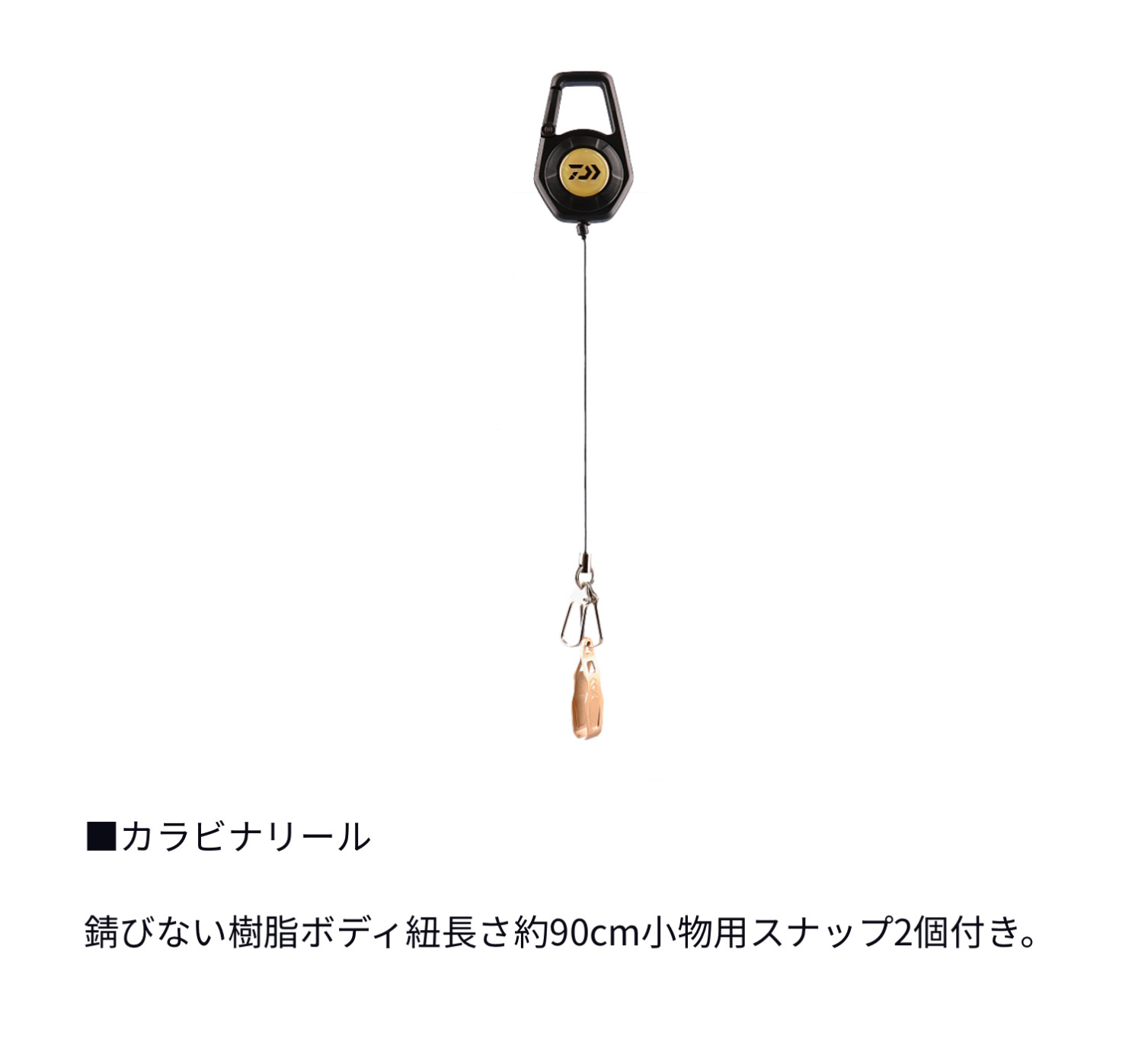 カラビナリールは錆びない樹脂ボディ、紐長さ約90cm。
