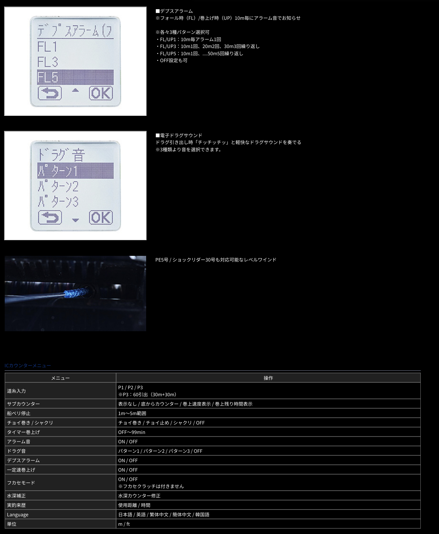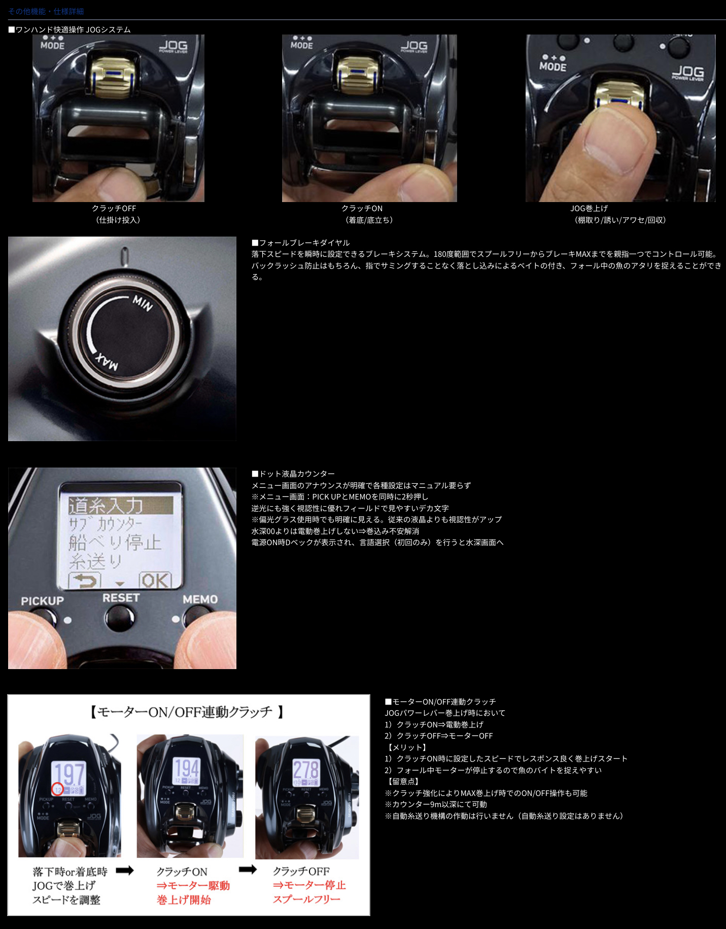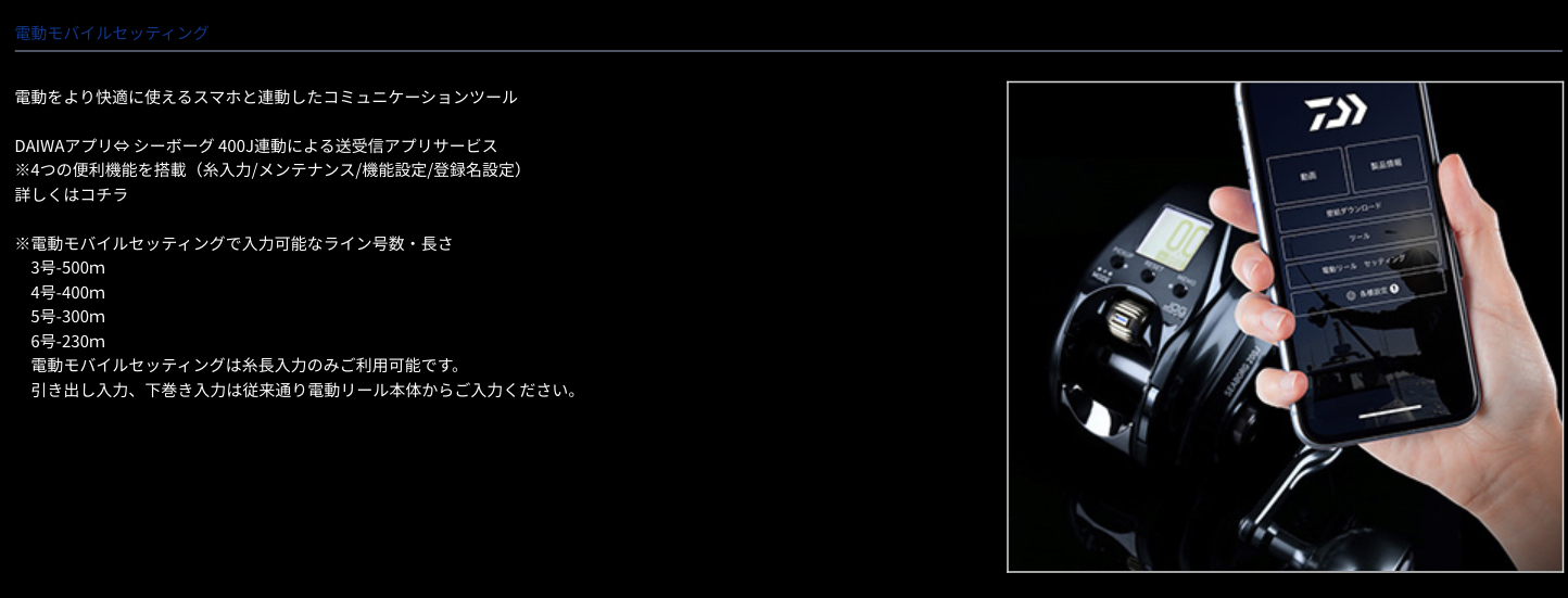 テクノロジーにおいては、ワンハンド快適操作JOGパワーレバー、トルクと瞬発力を両立したMAGMAXモーター、滑らかに効き続けるATD、防水・耐久テクノロジーMAGSEALEDボールベアリングとダイワテクノロジーをもれなく搭載。また視認性の高いドット液晶や落下スピードの調整に欠かせないフォールブレーキダイヤルを搭載し、電動モバイルセッティングも対応。SEABORG400Jが快適な釣りをサポートする。