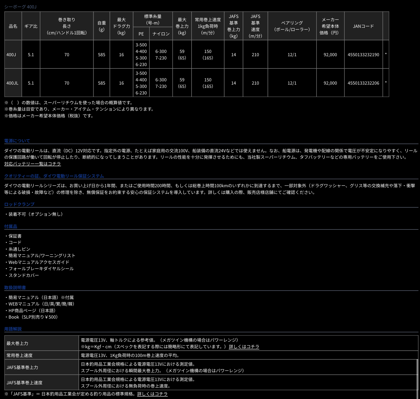 300サイズの様に快適に手持ちで釣りをしたいけれど、巻糸量は多くしたい。それでいてパワーやスピードは欲しい。そういった声を具現化したのがSEABORG400Jである。