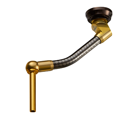 高次元での強度を目指した平滑成型屈曲カーボンパイプは航空、 宇宙分野で培った技術開発により実現した最高強度の炭素繊維「TORAYCAT1100G」を採用。 さらにカーボン繊維をとりまとめる接着剤的役割を担う複数種類の樹脂をナノメートルオーダーで混合することにより、 樹脂の高性能化・高機能化を実現した東レ㈱ナノアロイテクノロジー適応材料を用いた。 その結果、高強度かつ高弾性率化を実現。 さらに、DAIWAがもつカーボンテクノロジーを駆使し、 専用設計された「カーボンライトハンドル」。 その結果、従来のマシンカットハンドルと比べ、大幅な軽量化を実現した。 軽量かつ高強度・高弾性といった相反する要素を高次元で両立した唯一無二のハンドルアームだ。