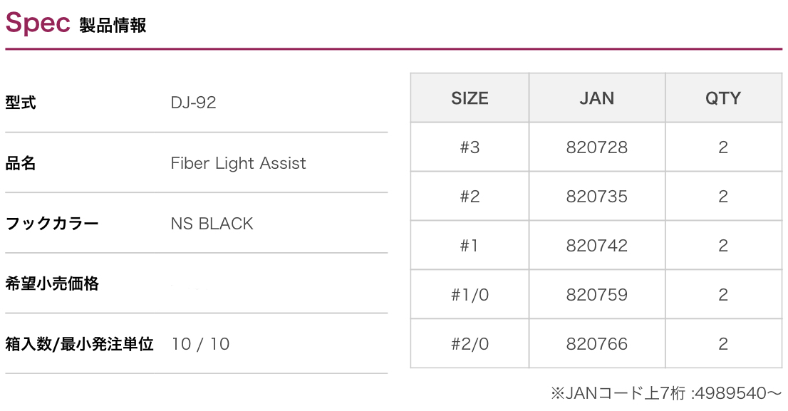 ベースは「DJ-90 ライトアシスト」。このフックにフラッシュファイバーをタイイング。コレが時にはジャコ、時にはアミを演出しアピール、更には吸い込み時のアシストともなり、より口内に吸われやすく、フッキング率もUP!「DJ-92 ファイバーライトアシスト」はただファイバーでデコレートし、キレイなだけではない実戦派アシストフックです。