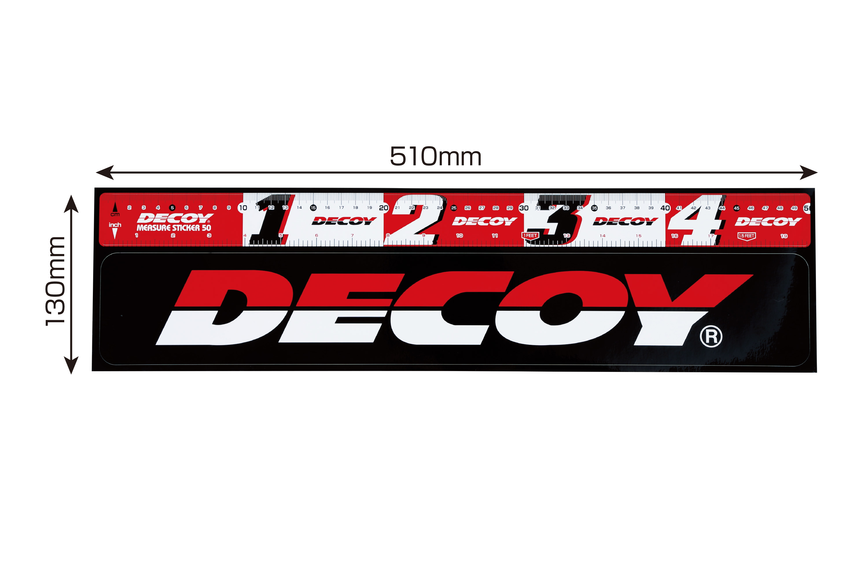 バスやソルトウォーターフィッシングに最適な50cmのメジャーステッカー。クーラー、タックルボックス、タモの柄、ボート等に貼って、釣れた魚をすぐに計測可能!センチ(cm)とインチ(inch)のダブル目盛。DECOYのビッグロゴステッカー付。