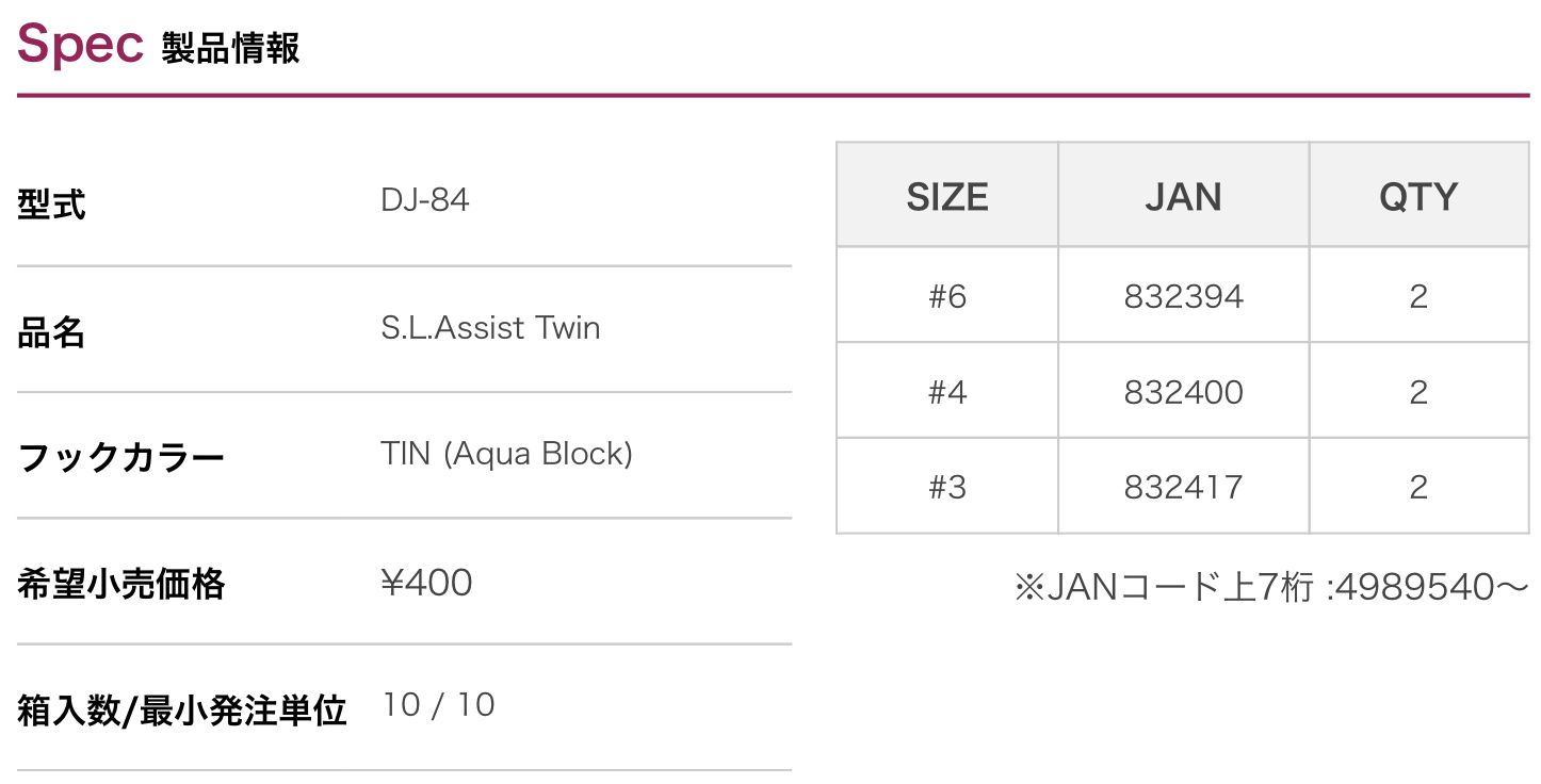 ライトタックルでの手軽さが人気のスーパーライトジギングに高次元で対応する、小型ジグ専用アシストフックです。フックは小型ながら強靭なマイクロパイクを採用し、不意の大型魚にも対応。フロント、リアどちらにも装着可能なショート&ツインタイプ。