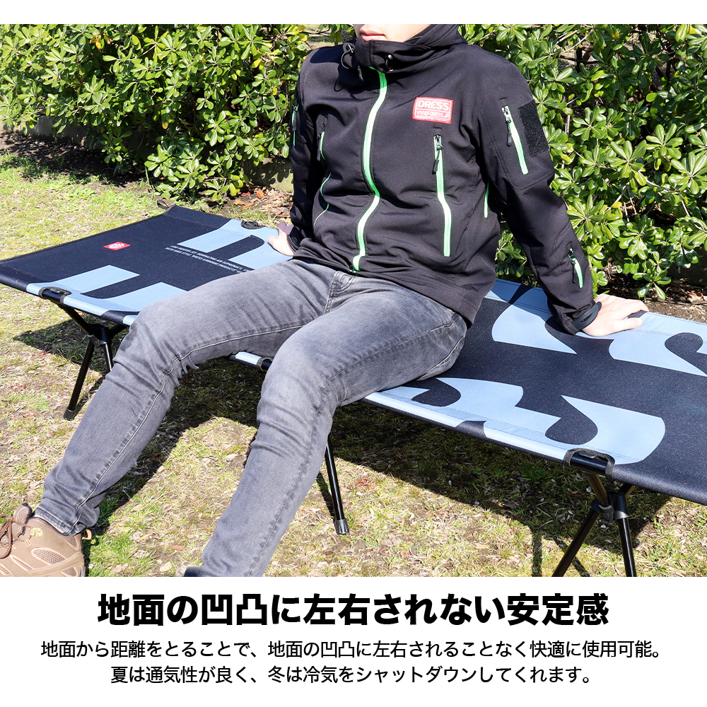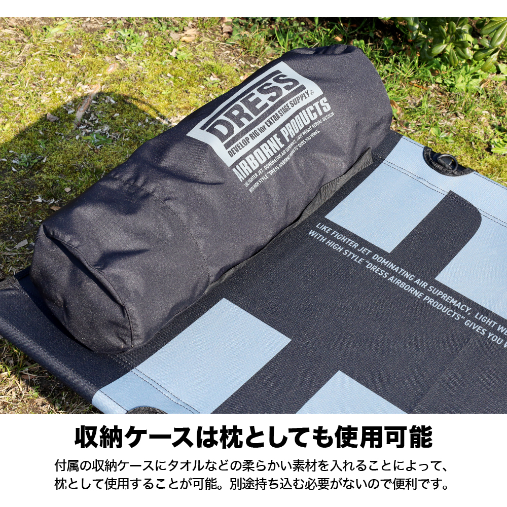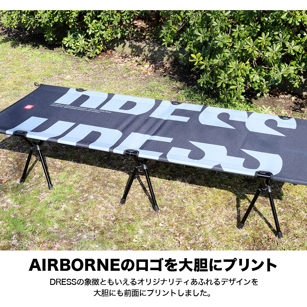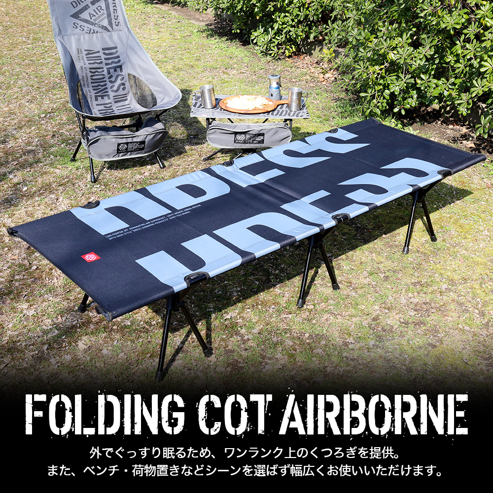 AIRBORNEロゴを大胆にプリントしたハイ、ロー切り替え可能な超軽量折り畳みコット