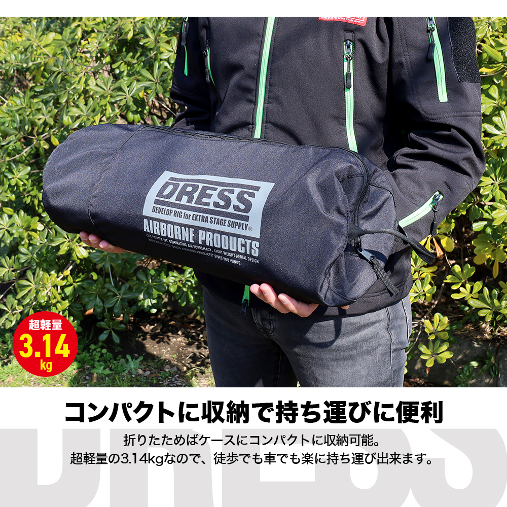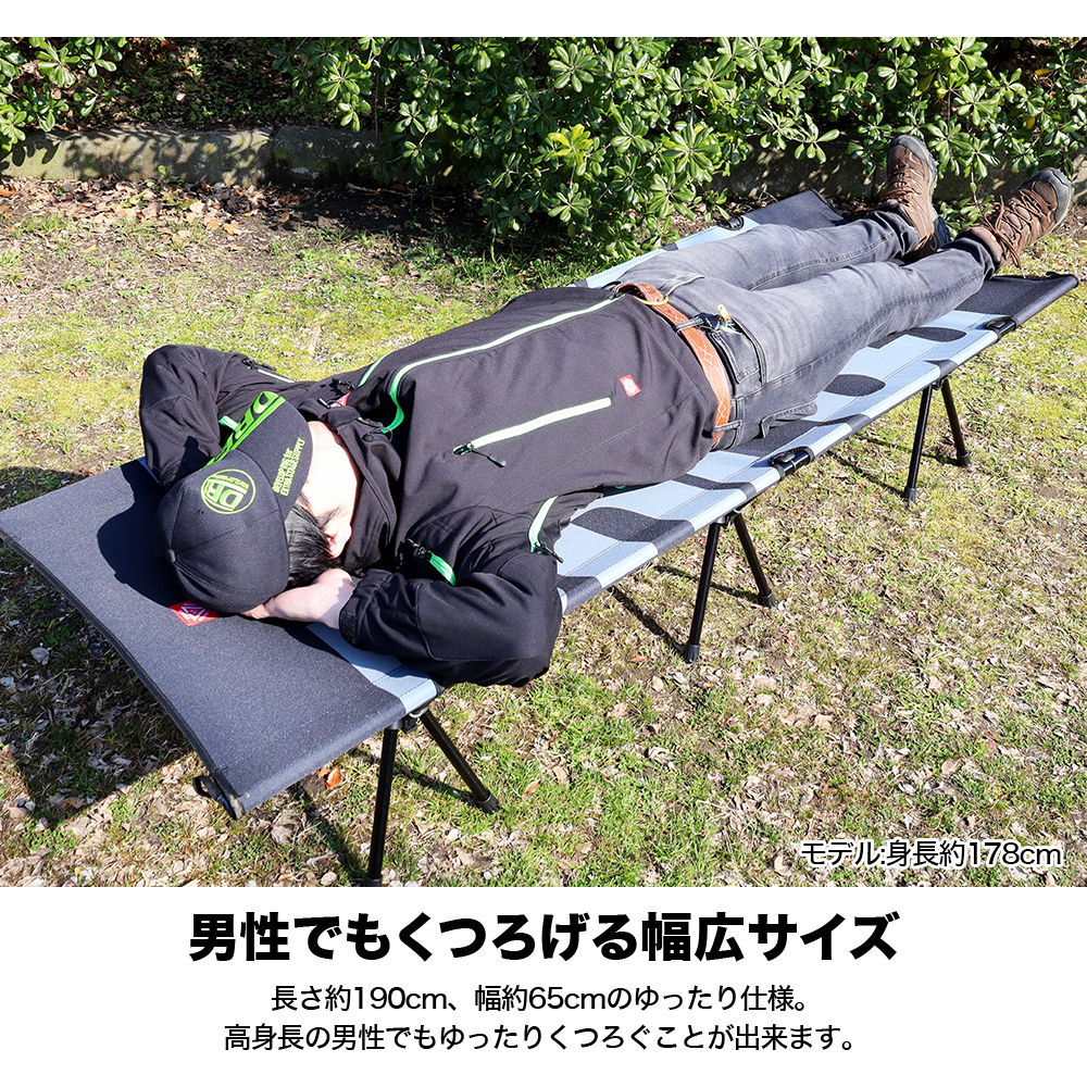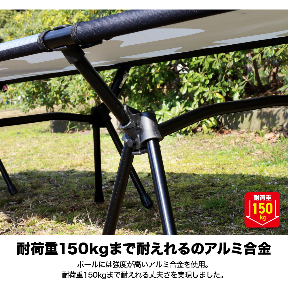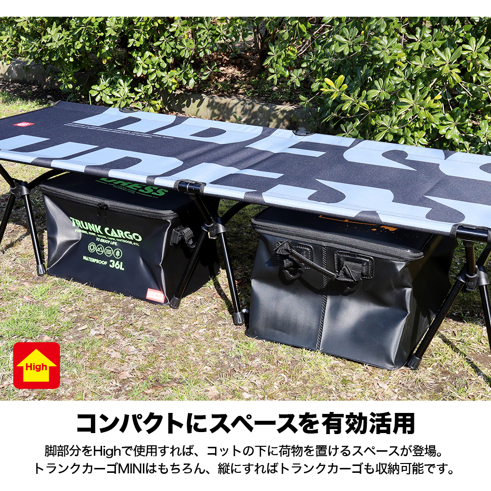 AIRBORNEロゴを大胆にプリントしたハイ、ロー切り替え可能な超軽量折り畳みコット