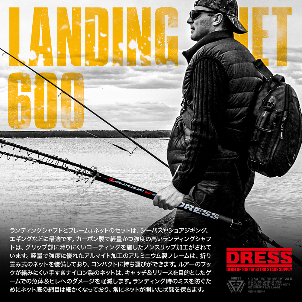 ランディングシャフトとフレーム+ネットのセットは、シーバスやショアジギング、エギングなどに最適です。カーボン製で軽量かつ強度の高いランディングシャフトは、グリップ部に滑りにくいコーティングを施したノンスリップ加工がされています。軽量で強度に優れたアルマイト加工のアルミニウム製フレームは、折り畳み式のネットを装備しており、コンパクトに持ち運びができます。ルアーのフックが絡みにくい手すきナイロン製のネットは、キャッチ&リリースを目的としたゲームでの魚体&ヒレへのダメージを軽減します。ランディング時のミスを防ぐためにネット底の網目は細かくなっており、常にネットが開いた状態を保ちます。