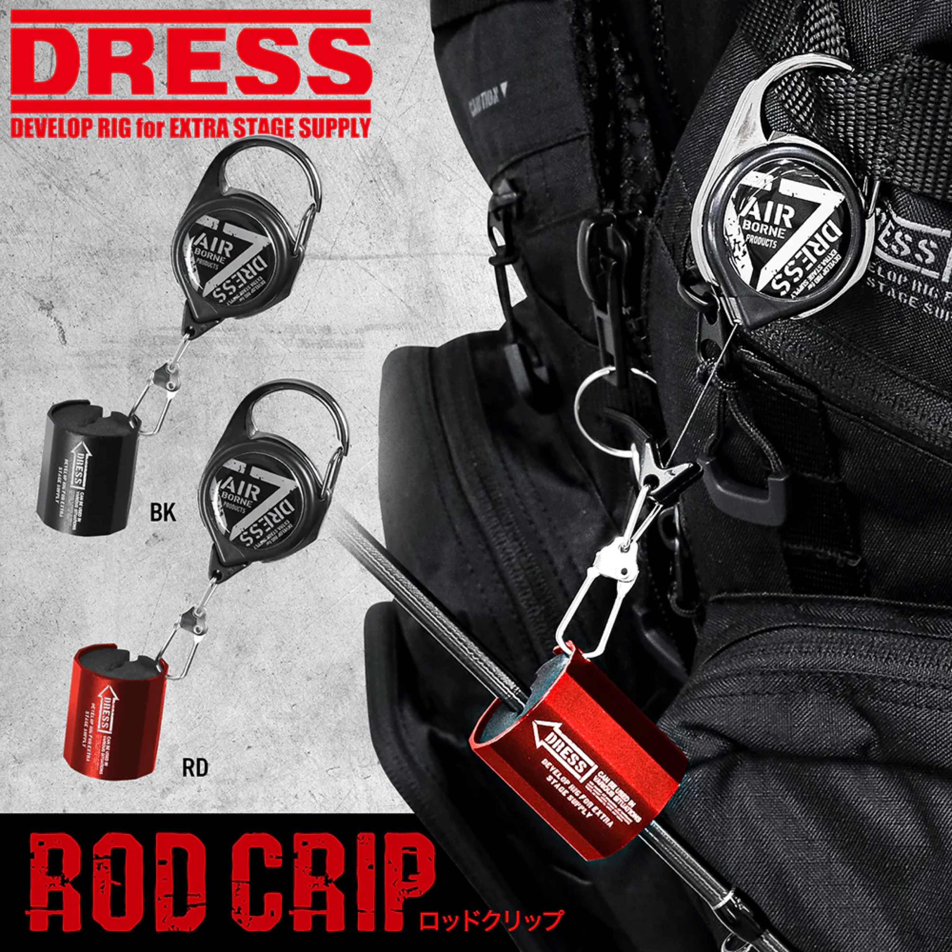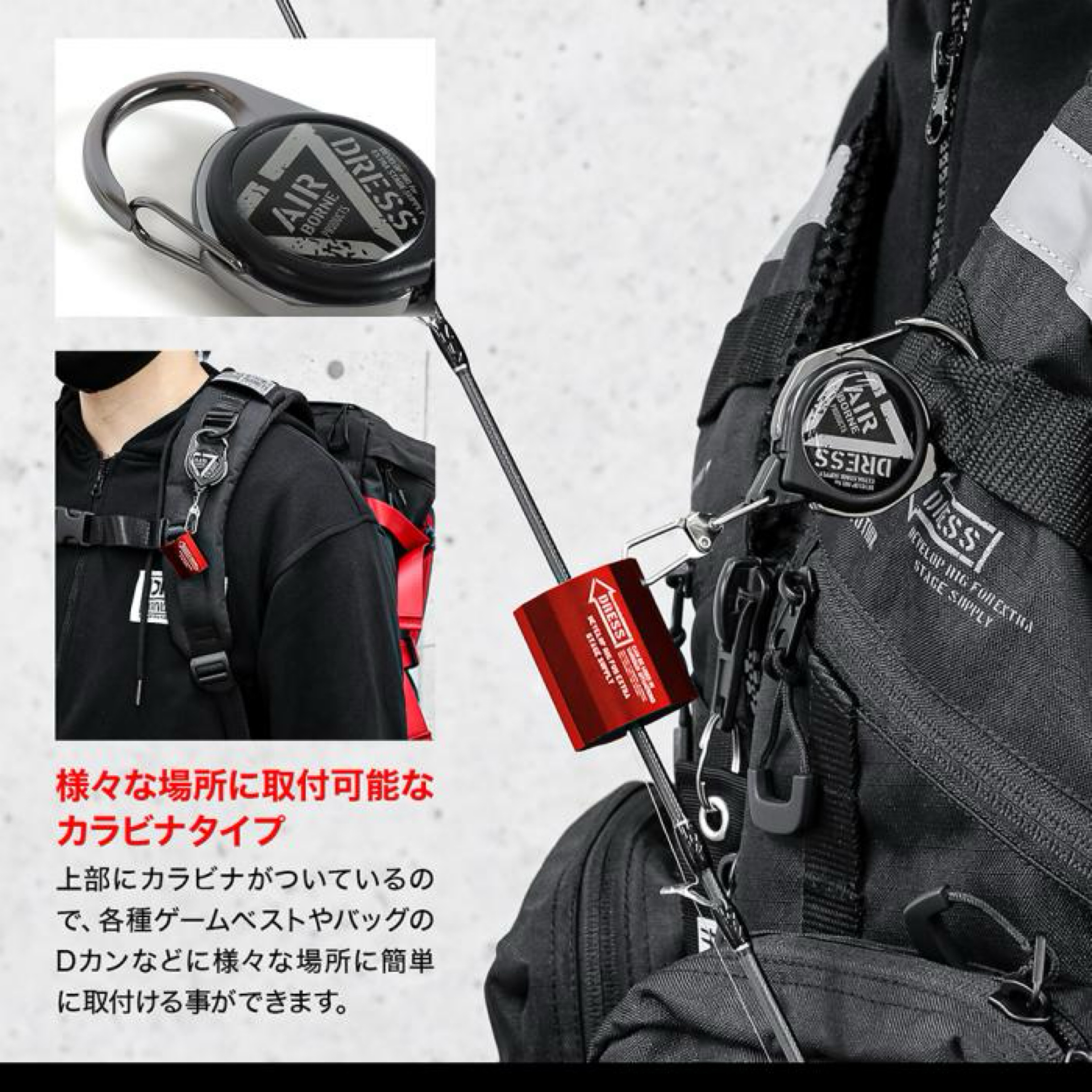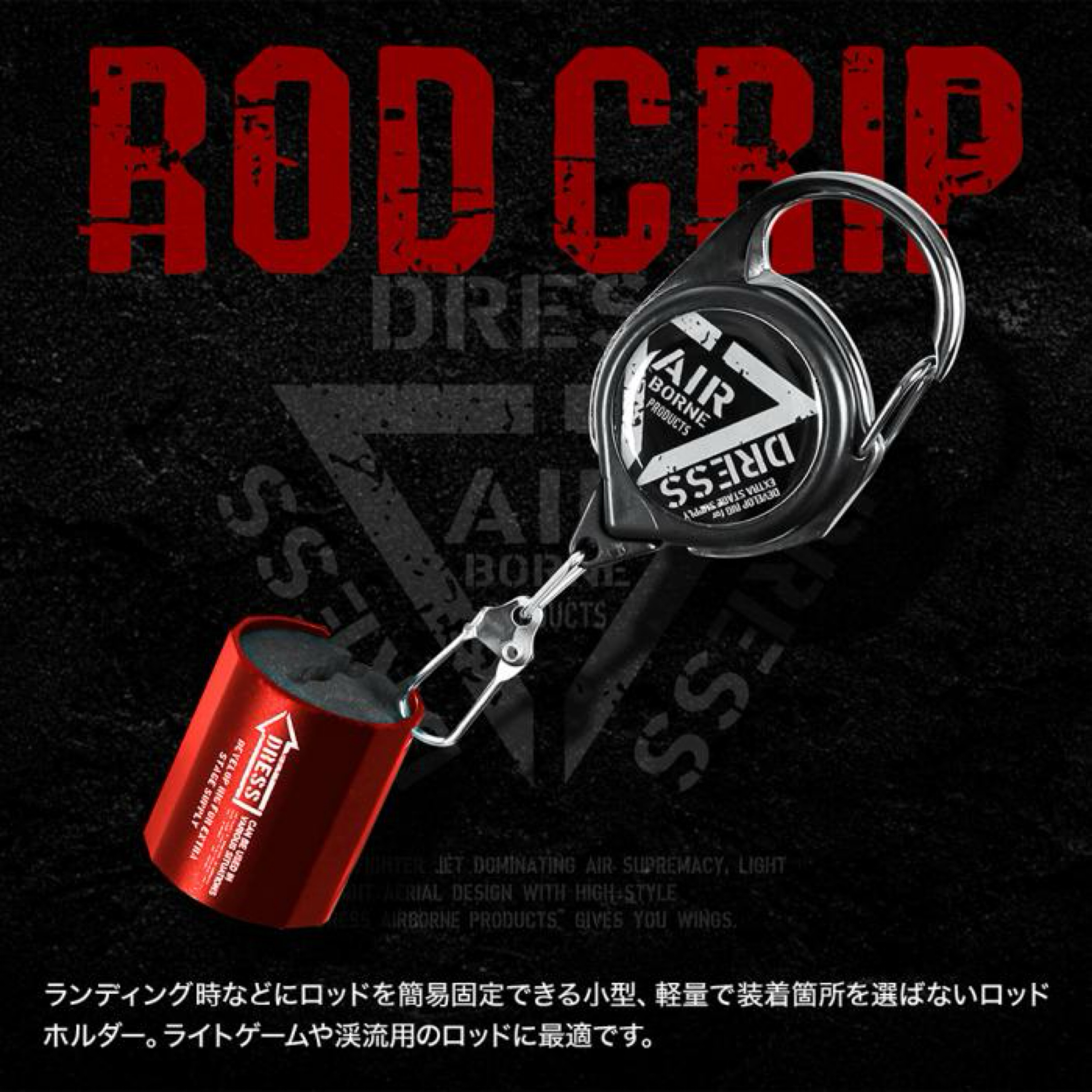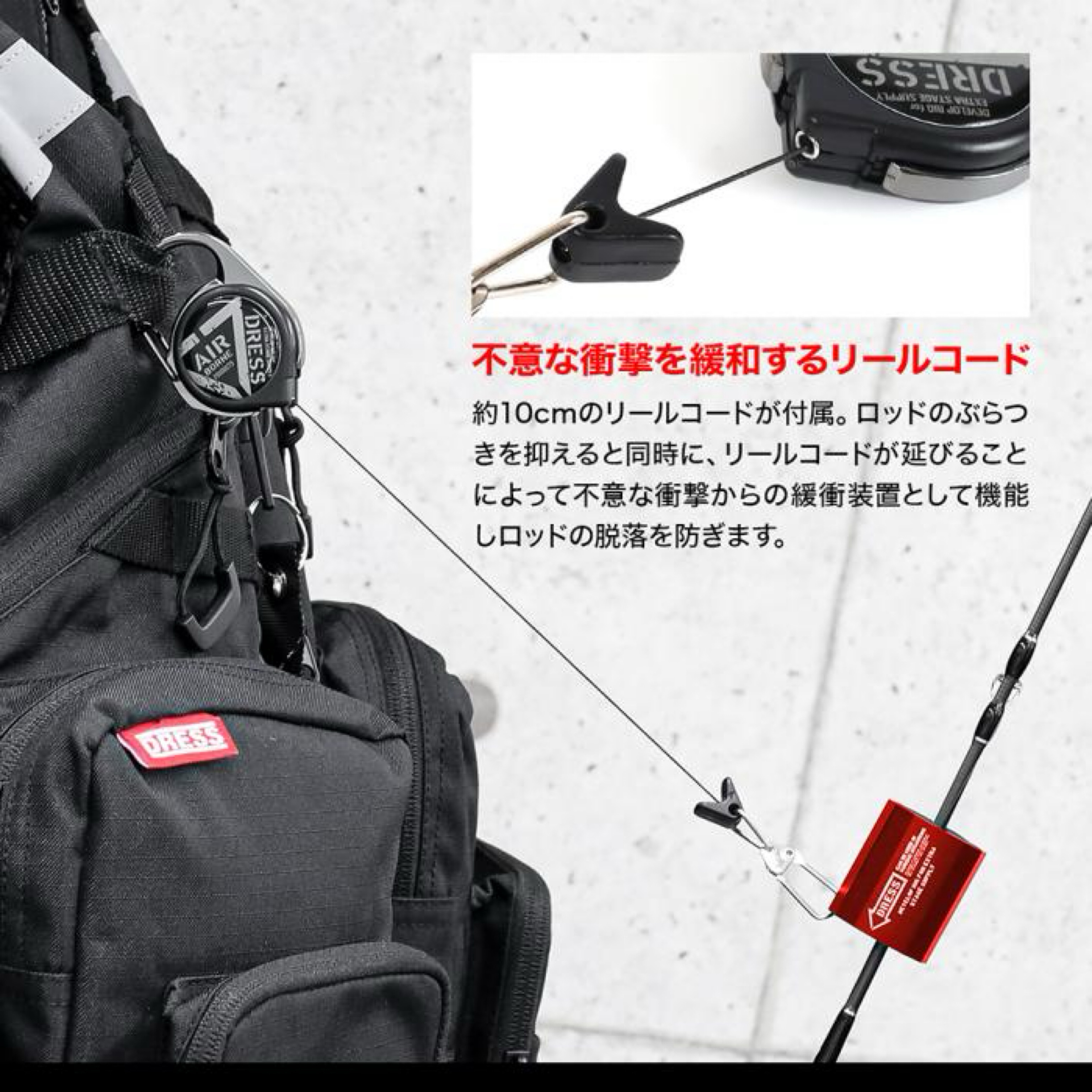 各種ゲームベストやバッグ等に簡単に取付ける事ができ、ルアーチェンジやランディング時に重宝します。ライトゲームや渓流用の直径約8〜3mm程の軽量タックルの保持に最適です。付属リールコードは約10cmに設定しロッドのぶらつきを抑えると同時に緩衝装置として機能しロッドの脱落を防ぎます。