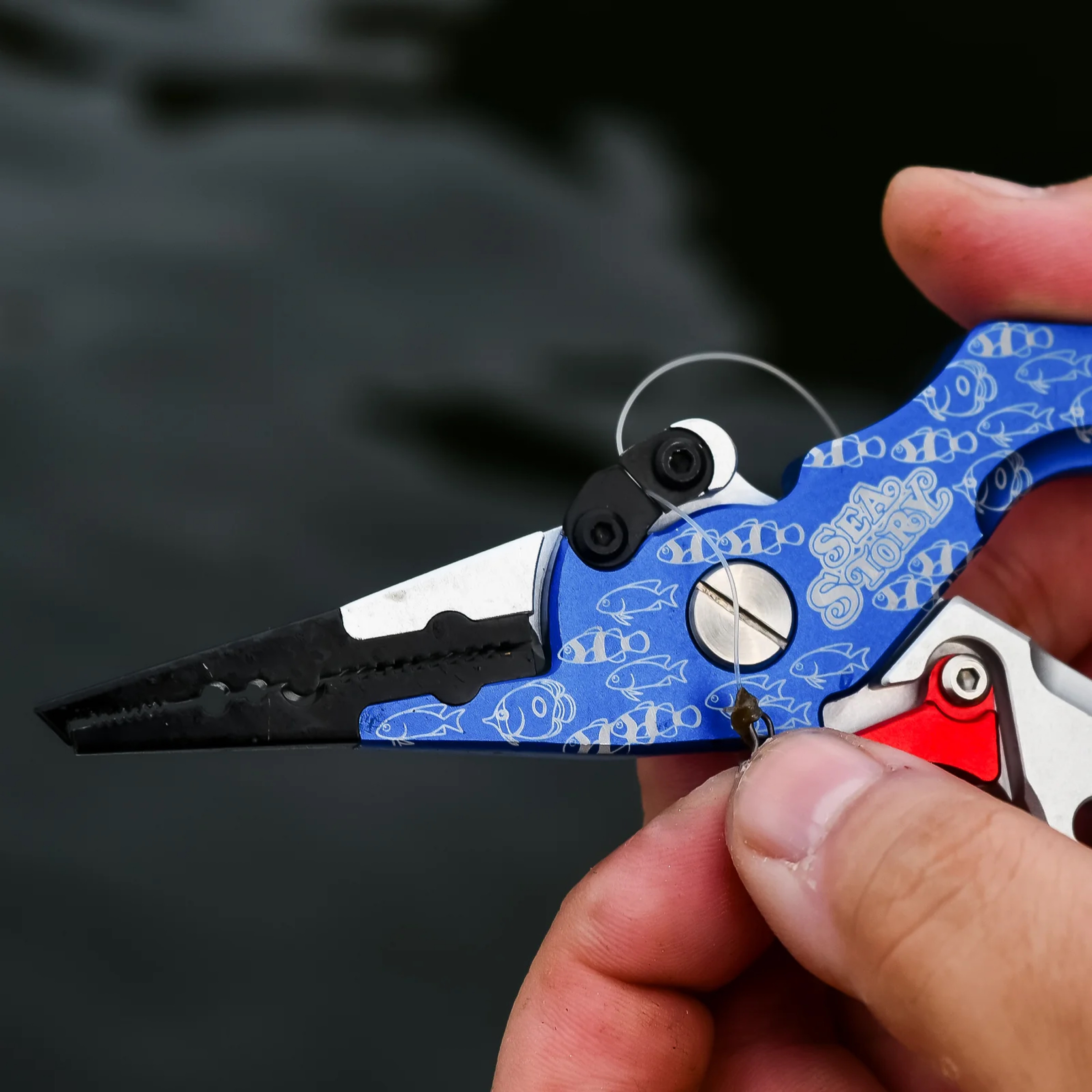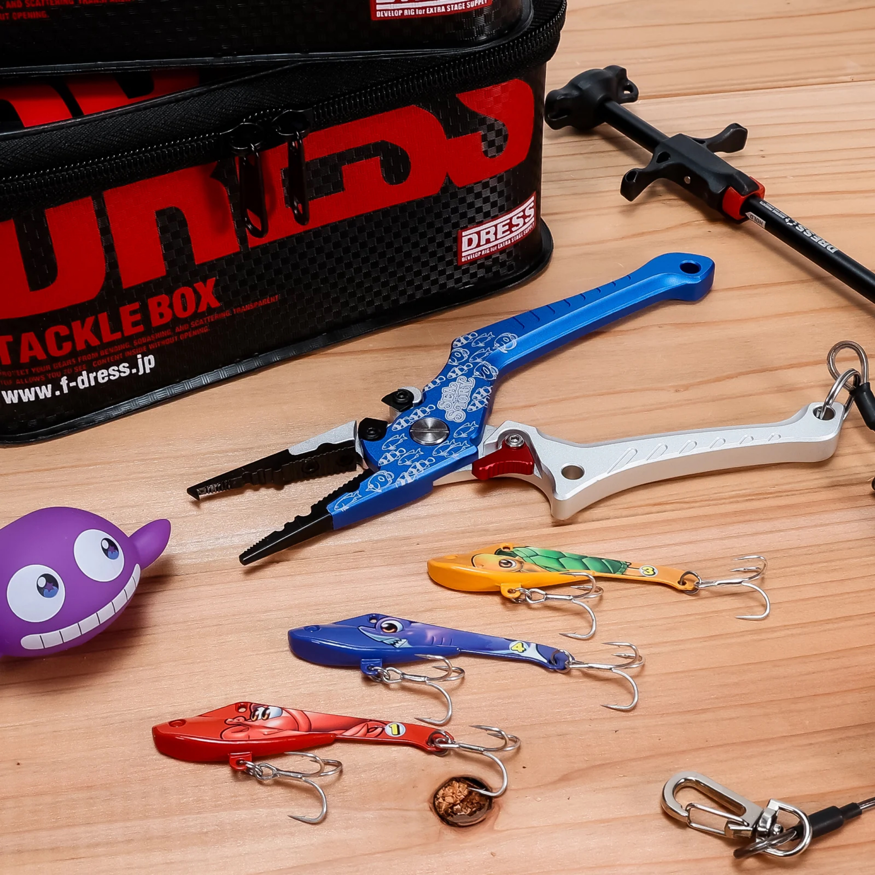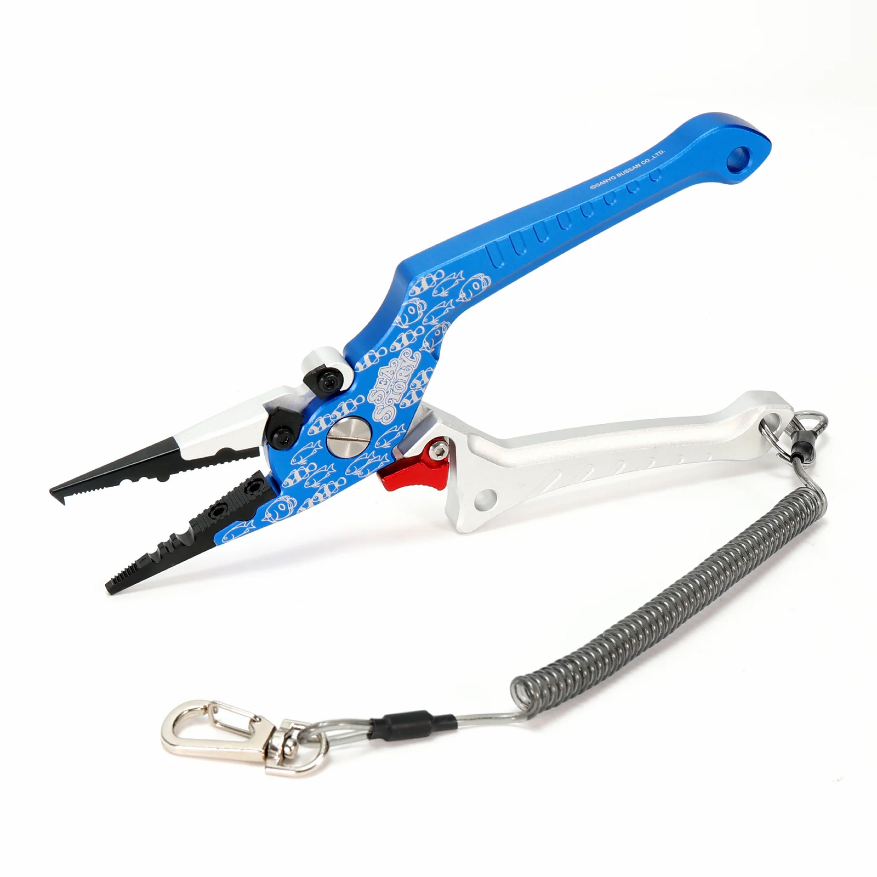 海物語の魚群をモチーフにしたデザインのフィッシングプライヤーです。工具のペンチとは異なり、釣り専用にカスタマイズされた多機能な釣り用ツールです。スプリットリングオープナーやラインカッター、ガン玉つぶしなどの多彩な機能を備えています。ロック機能も付いているため、初心者の方も安全に使用できます。ノーズが長く、釣った魚から針を外す際も怪我の心配が少ない優しい形状に仕上げました。ランヤードホールと落下防止のランヤード(スパイラルコード)付きなので、作業時にもスマートにプライヤーを取り出すことができ、失くす心配も少なく実用的です。魚から針を外したり、ナイロンラインを切ったりと、釣りで大活躍する便利なフィッシングプライヤーです。