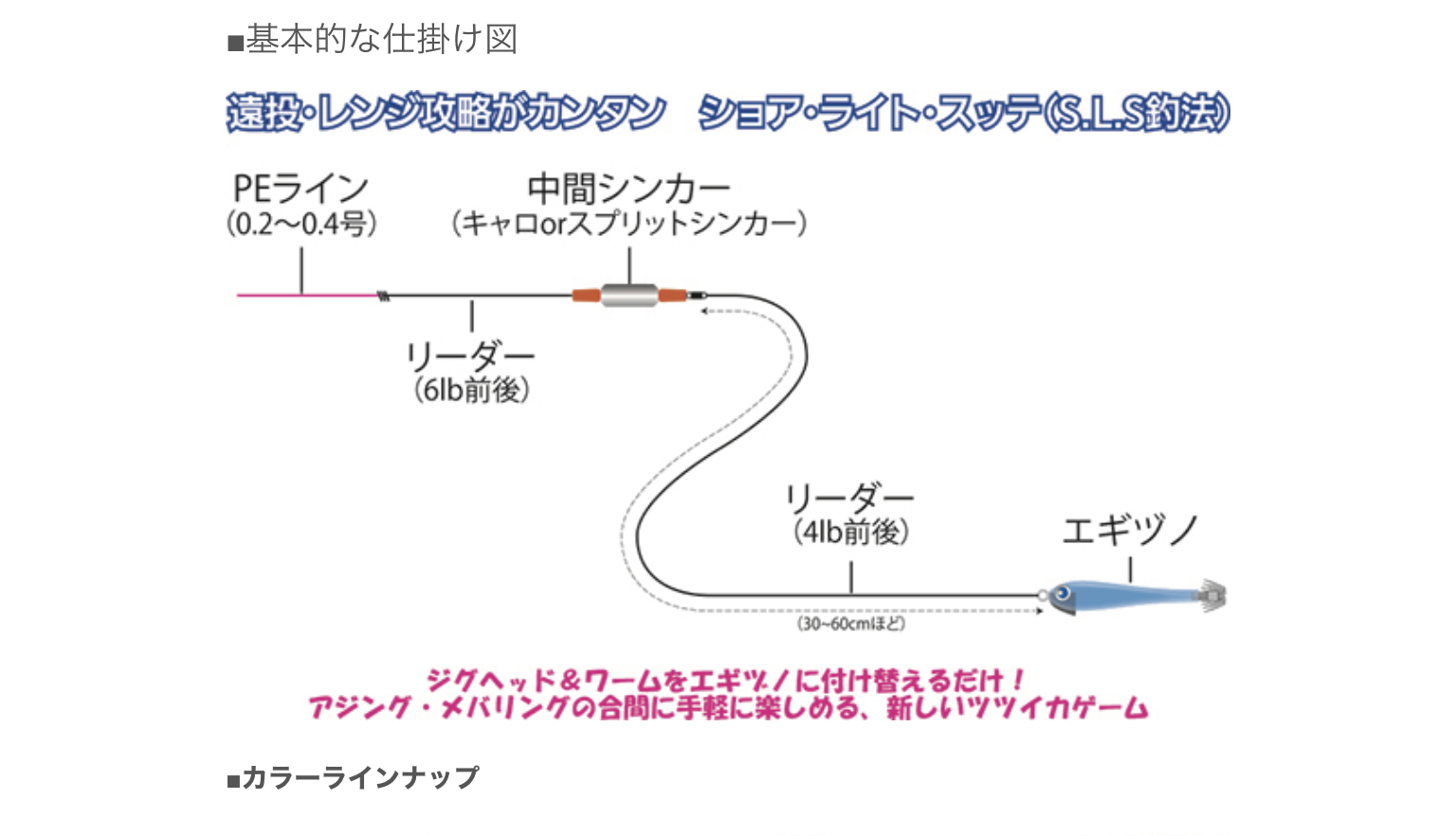 スプリットショットリグや、キャロライナリグなどの分離リグと組み合わせれば、2号クラスのエギ単体を使用したライトエギングとは比べ物にならない圧倒的な飛距離で、広範囲をスピーディに攻略することが可能になります。