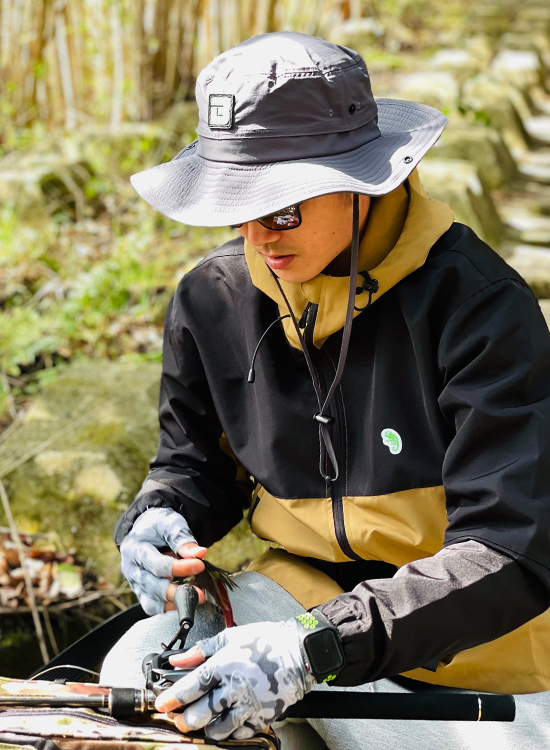 顔はもちろん、対策が疎かになりがちな耳や首周りも紫外線からガードするジャングルハット。メッシュベンチレーションを360°配置することで高い通気性を確保し、ムレを排出。さらに、多少の雨なら対応可能な撥水加工生地を採用しました。