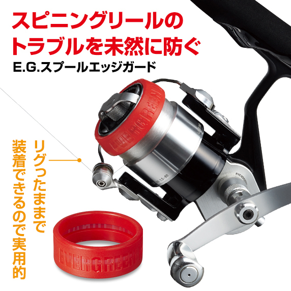 飛距離ダウン、ラインブレイクの原因となるスプールエッジのキズ。不注意でリールを何かにぶつけてしまった、落下させてしまったという場合はもちろん、どんなに注意していても知らず知らずのうちにキズが……なんてことも。対策は簡単。E.G.スプールエッジガードを装着するだけで、スピニングリールのトラブルを未然に防ぎます。