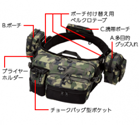 使用頻度の高いメインファスナーをビスロンタイプに変更し海水が掛かっても塩噛みしにくく固着を軽減。また、3つの専用付属ポーチはスマホ対応となった携帯ポーチをはじめ各ポーチの容量、形状を変更しました。