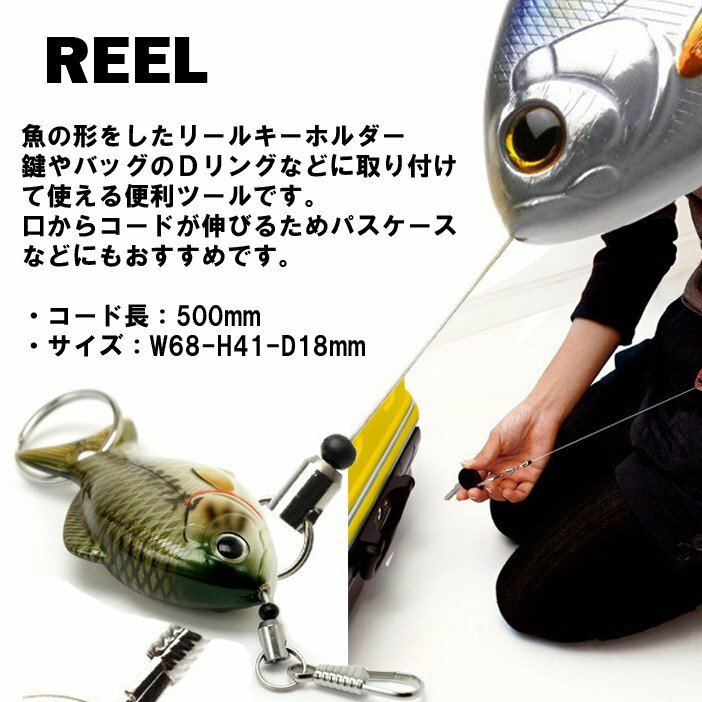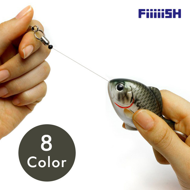 FISH REEL(フィッシュリール)はキーリングやバッグのD-リング等に取り付けて使える便利なリールキーホルダーです。口からコードが伸びるため、鍵やIDカード等を取りつけて使用する事が出来ます。水場などで落としてしまわぬ様に、リールで下げておきましょう。