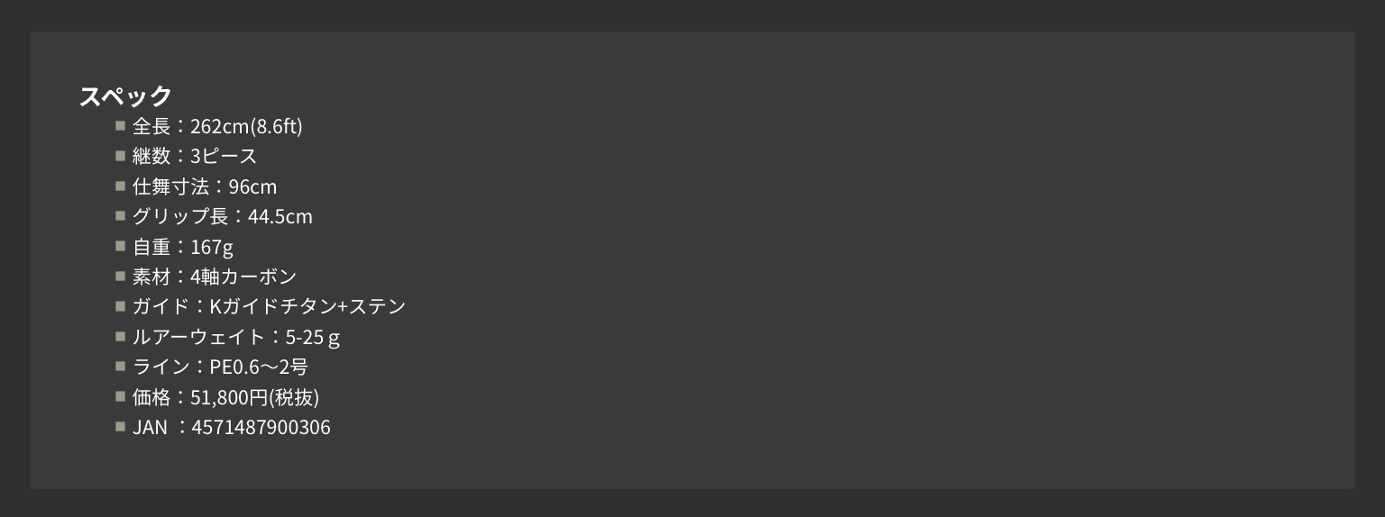 バット部の継ぎセクション位置が7.3Lよりも長くなったことによって、キャスティングがしなやかなのにシャープという印象をうけるだろう。