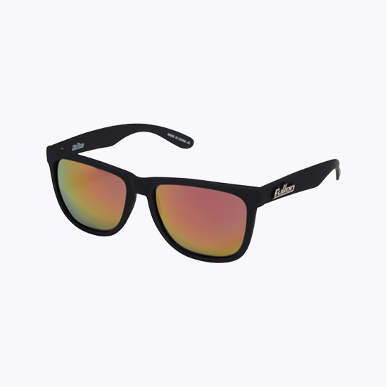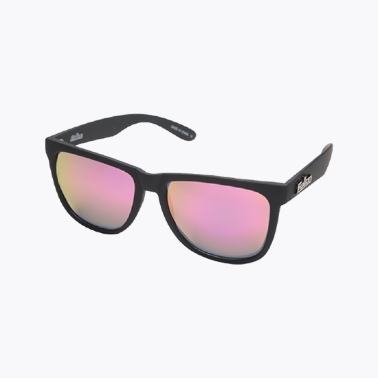 ウェリントン型をアレンジしたフェイスにフレームカラー、レンズカラーのバリエーションが豊富なのが特徴。マットブラックのフレームにレボミラー偏光レンズ ※メガネ拭き兼用超繊維巾着袋付き
