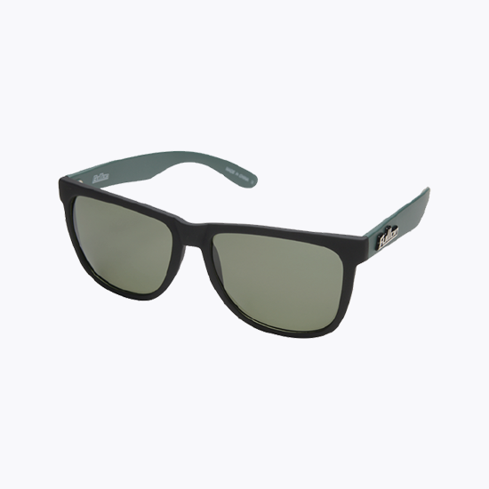 マットブラックなフェイスにマットなダークグリーンのテンプルという渋い組み合わせにはスモーク偏光レンズをセット ※メガネ拭き兼用超繊維巾着袋付き