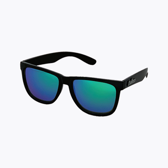 光沢のあるブラックのフレームにグリーンのミラー偏光レンズをセット。 ※メガネ拭き兼用超繊維巾着袋付き