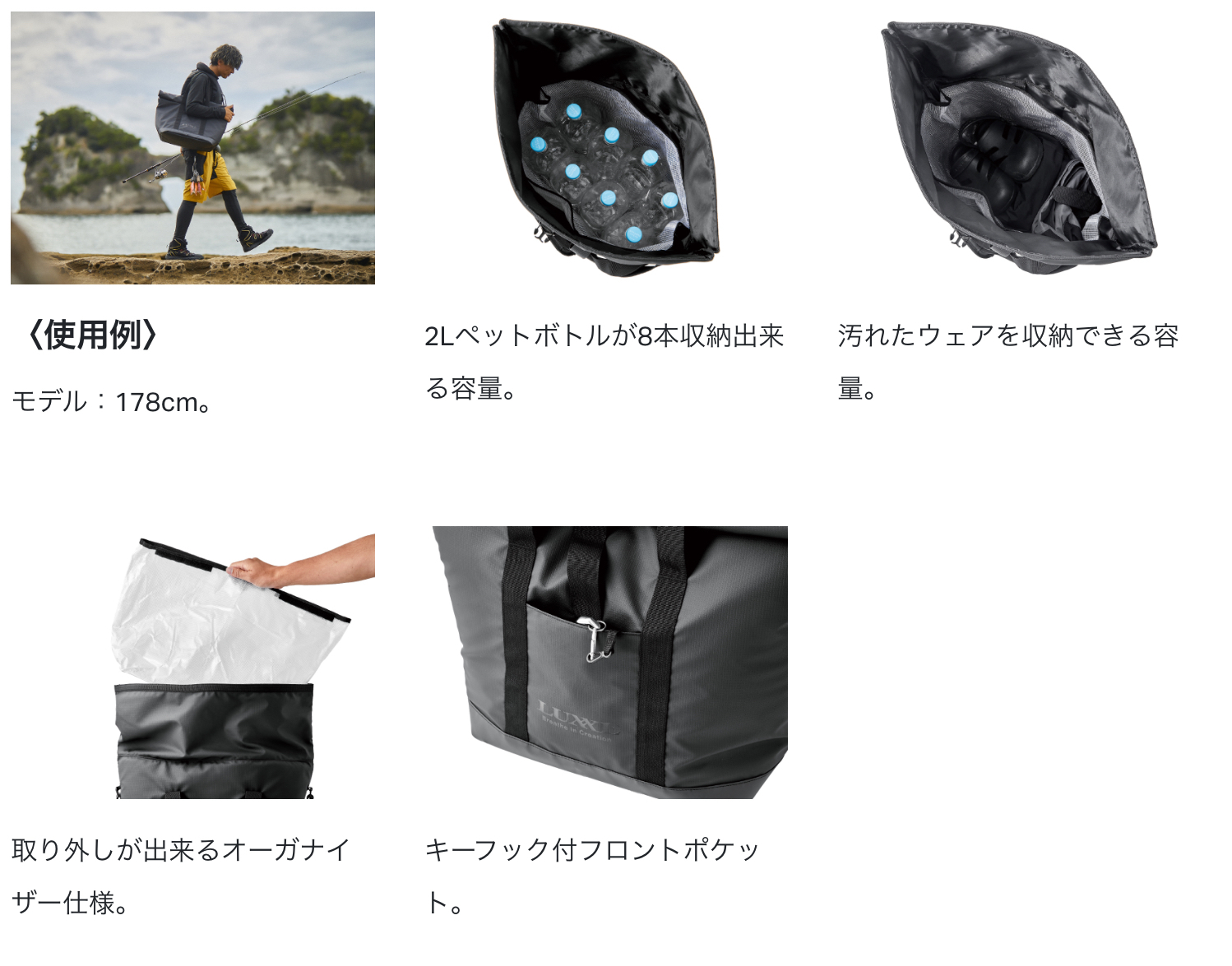 簡易クーラーとして使用できる最大46L(通常時は43L)の収納力あるトートバッグ。