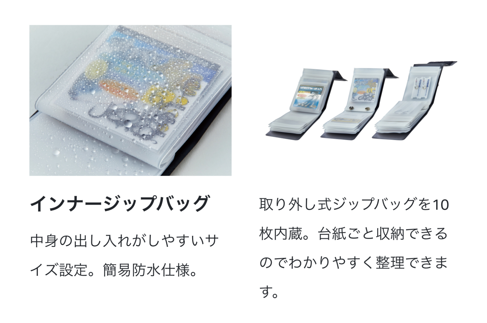 ●ジップバッグは取り外し可能。台紙ごと収納できるサイズ設定で出し入れがスムーズ。