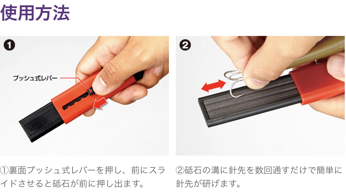GMフックシャープナーは、ケースに砥石部分をスライド収納できる持ち運びに便利なモバイルシャープナーです。ダイヤ砥石採用でフック素材を選ばず、砥石の溝に針先を数回通すだけで簡単に研ぐことができます。